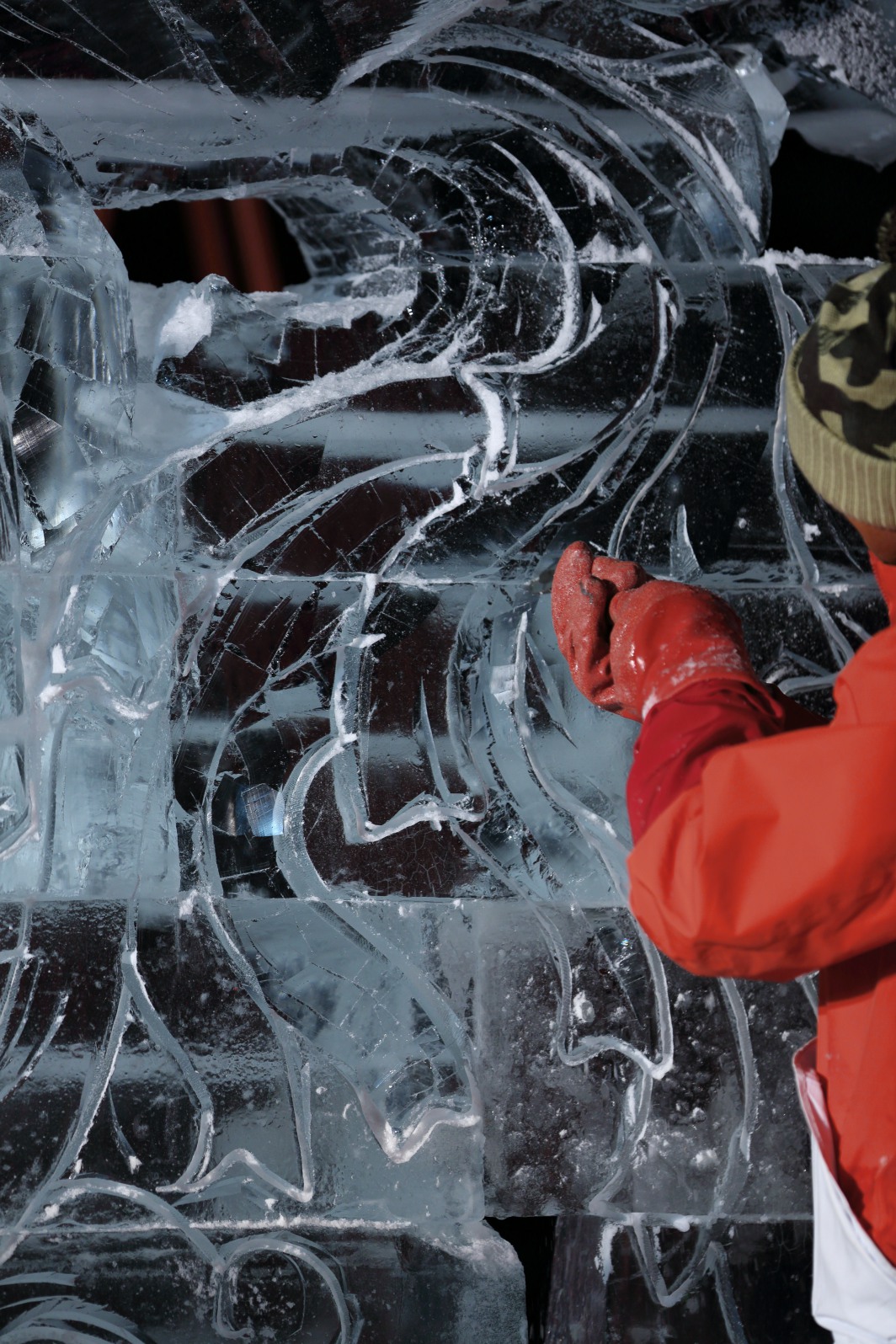 筋彫りを氷全体に延長していく。