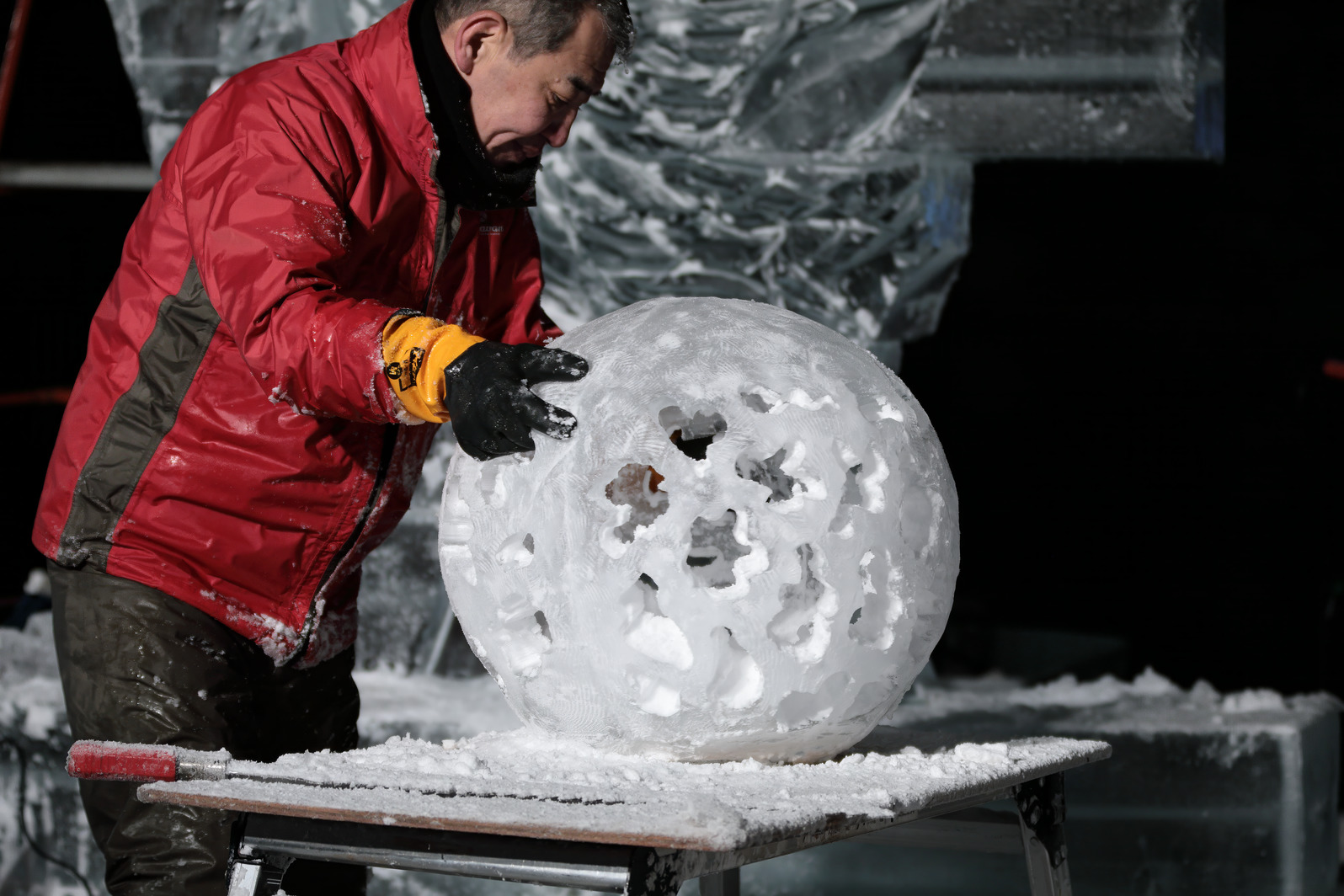 加瀬さんが半球状に氷を削っている。