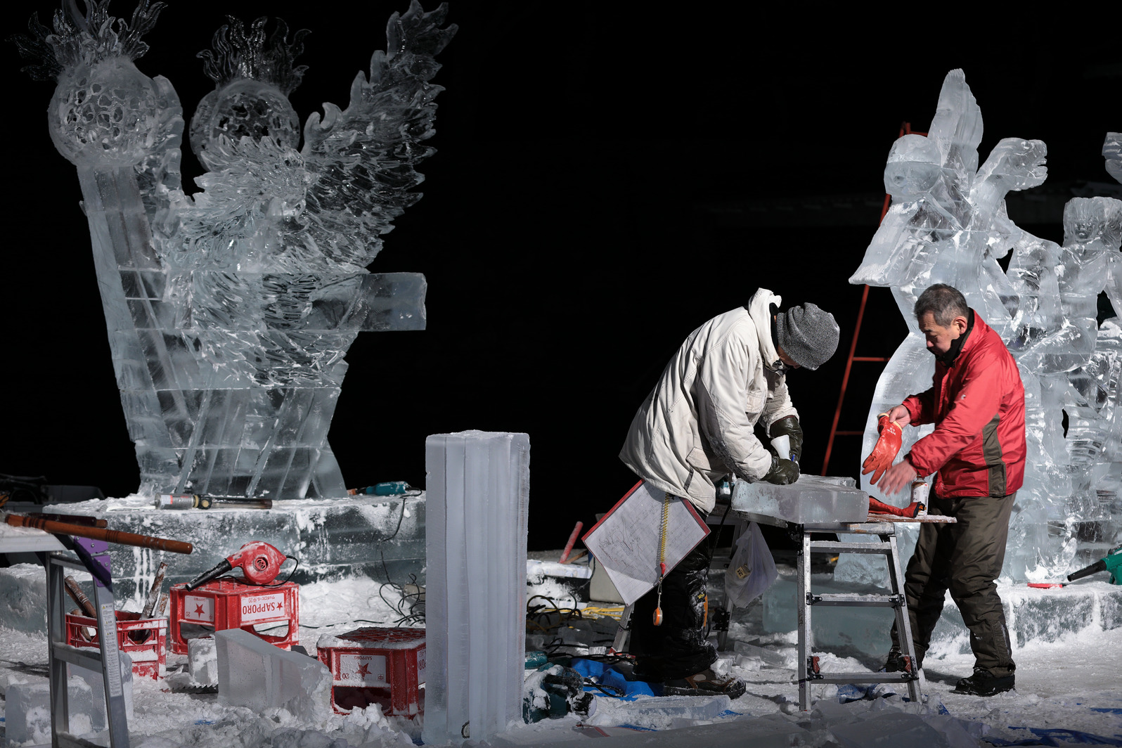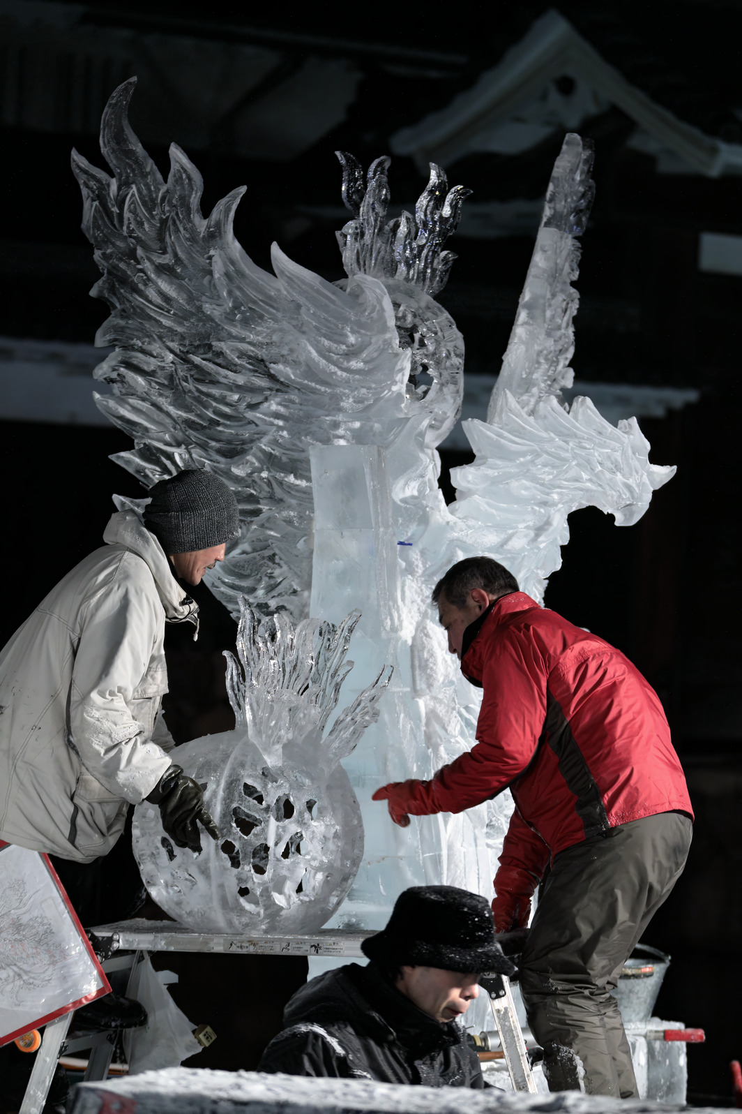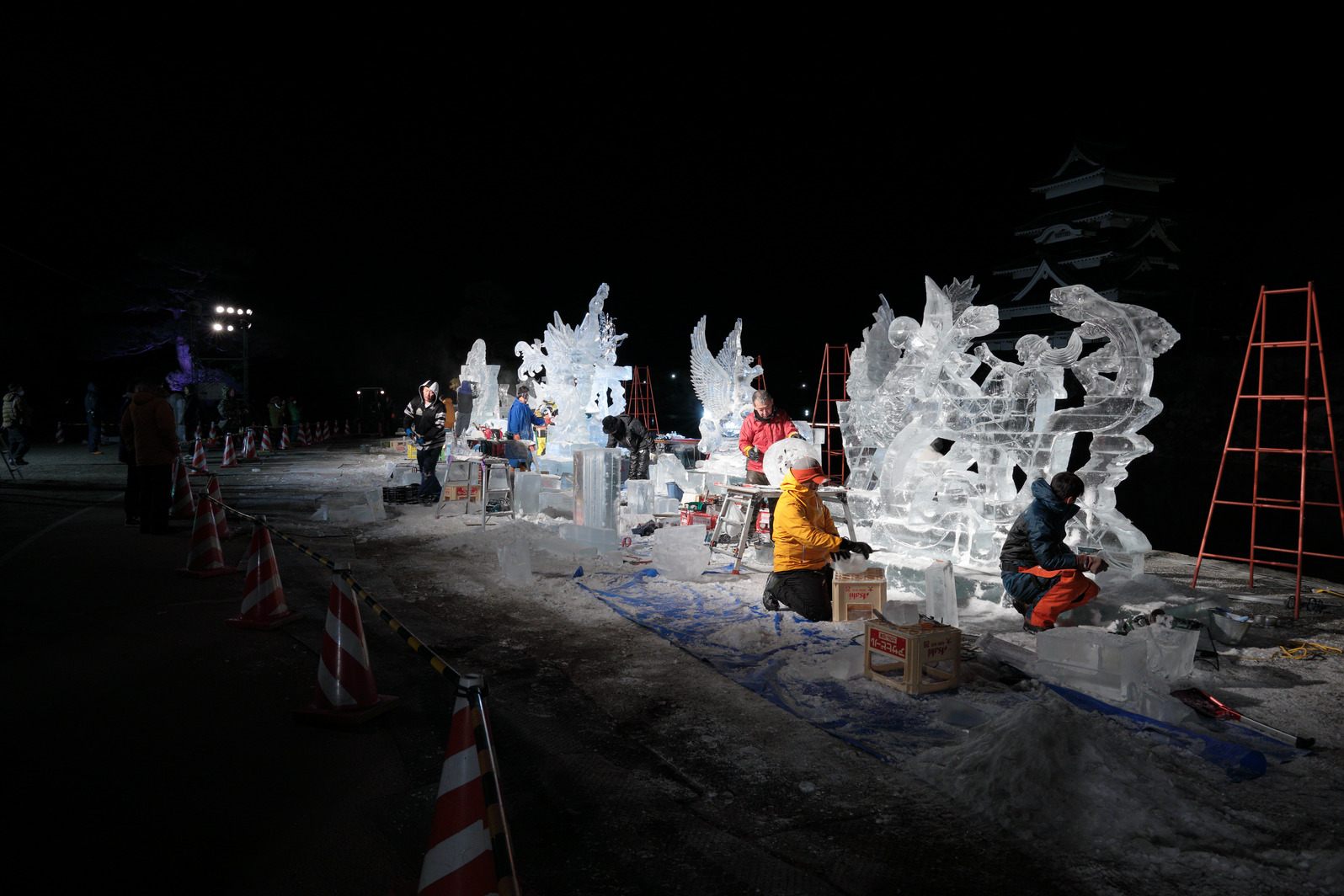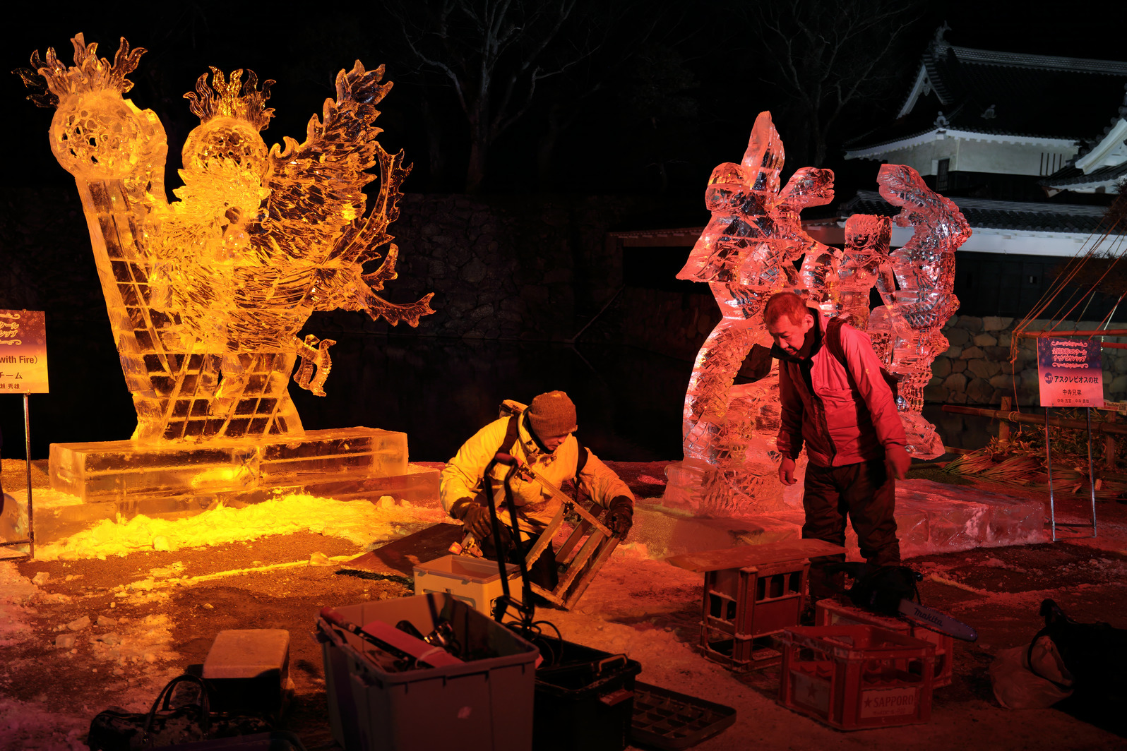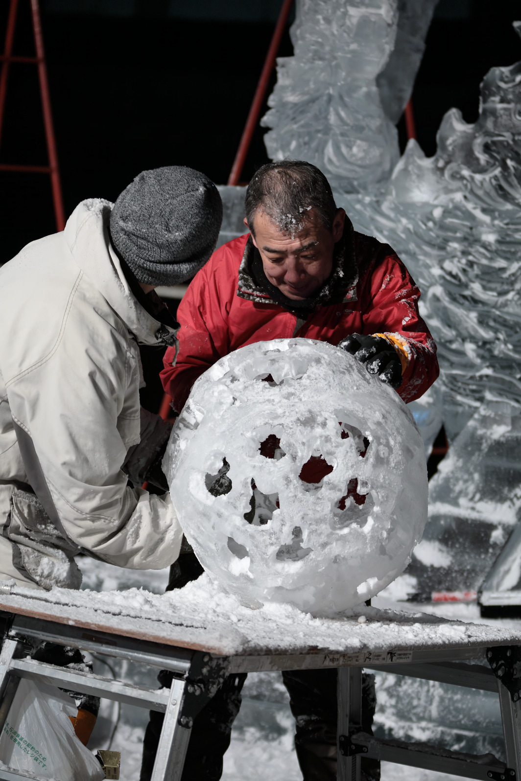 きらびやかな色照明や、まばゆい朝日に照らされる氷像の美しさを味わうのはもちろんだが、それに加え、氷像を作り上げるまでの彼らの戦いぶりを見届けることで初めて、「氷彫刻を見た」と言えるのではないか、と思う。