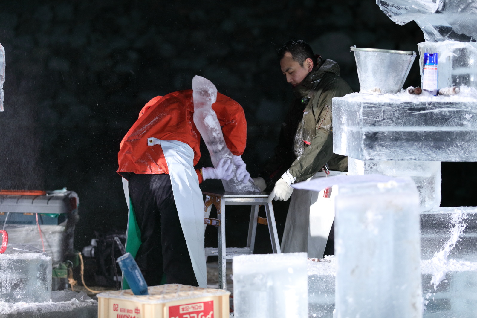 全力で氷を彫る選手たちを、会場スタッフもまた全力で支援する。