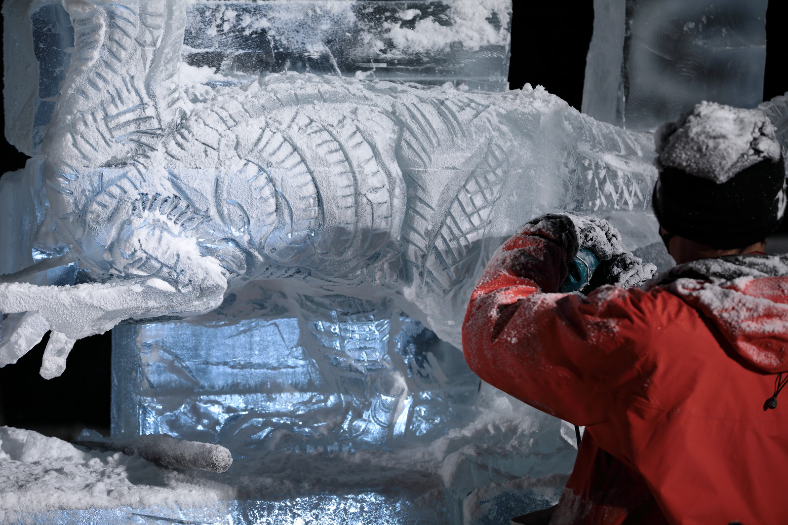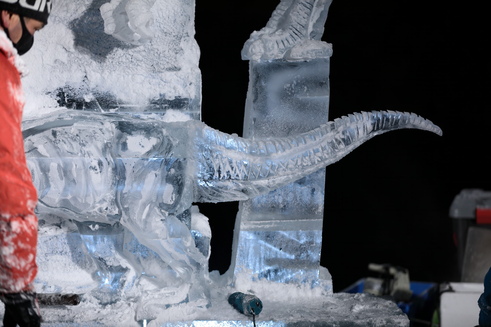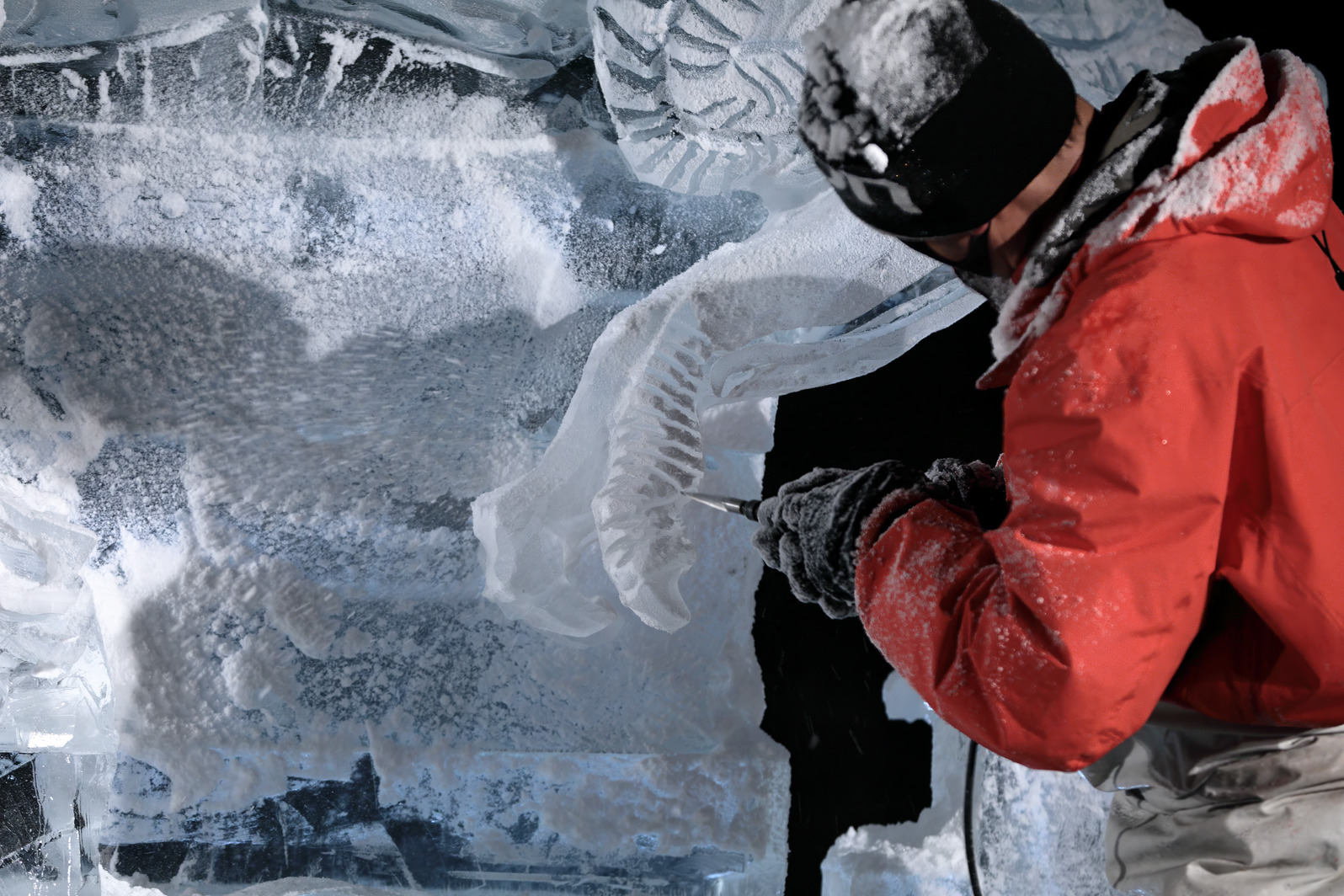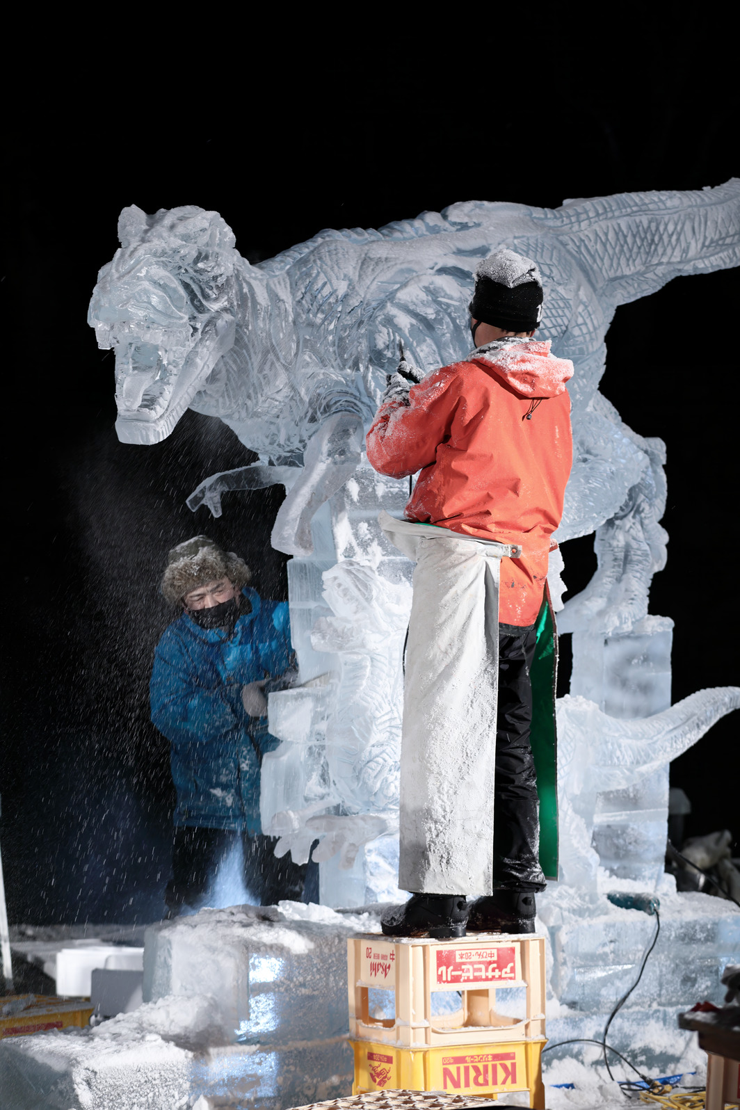 氷像下部をノミで彫り込んでいく。
