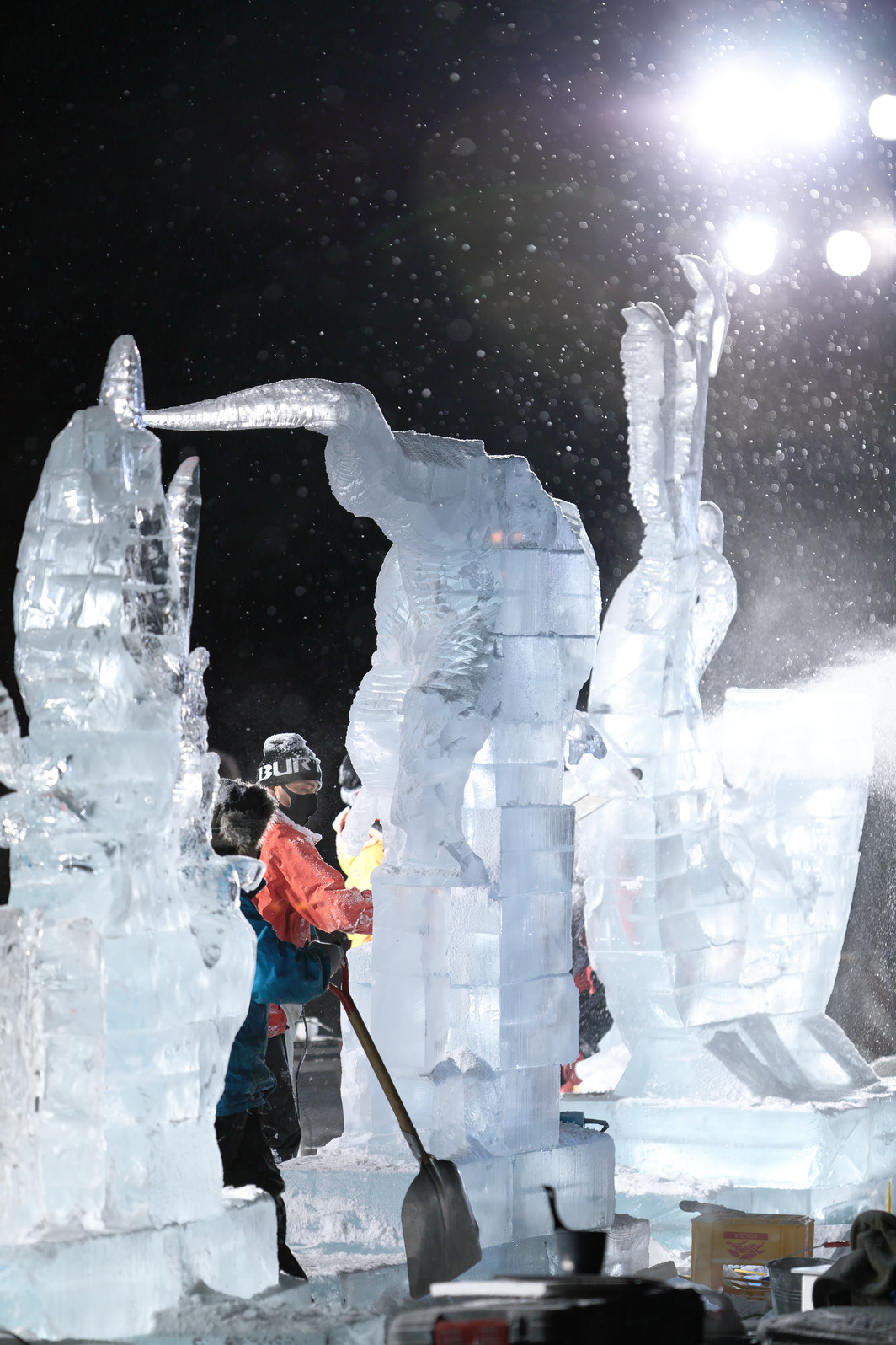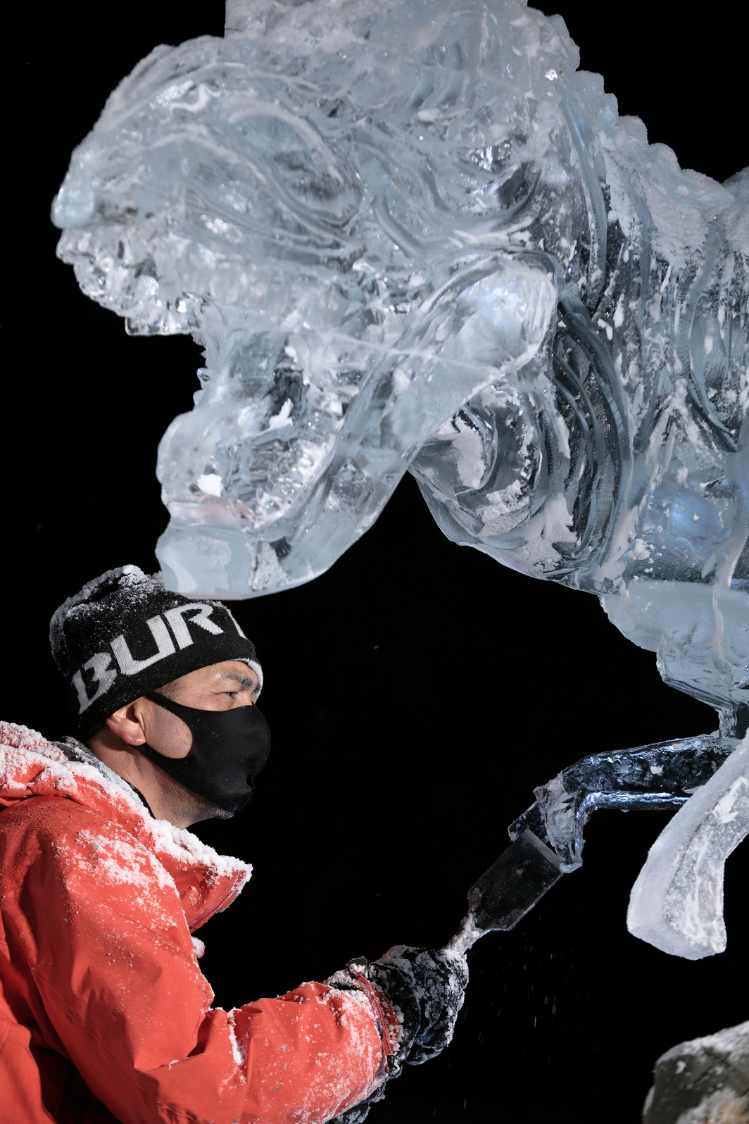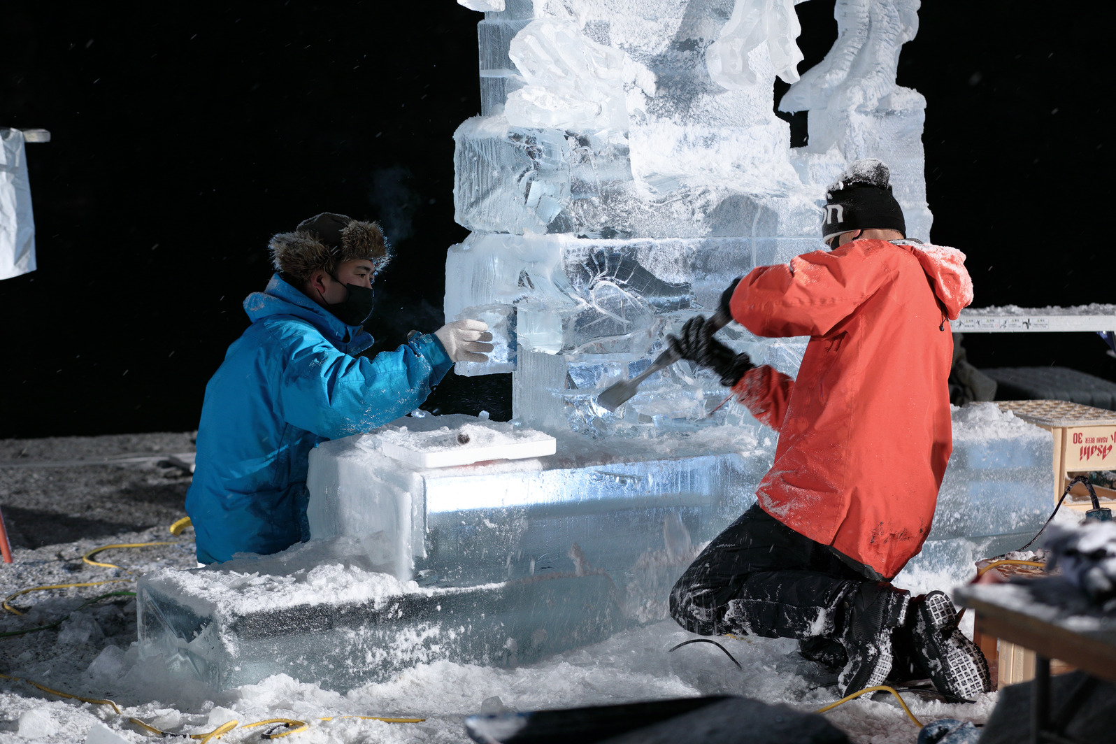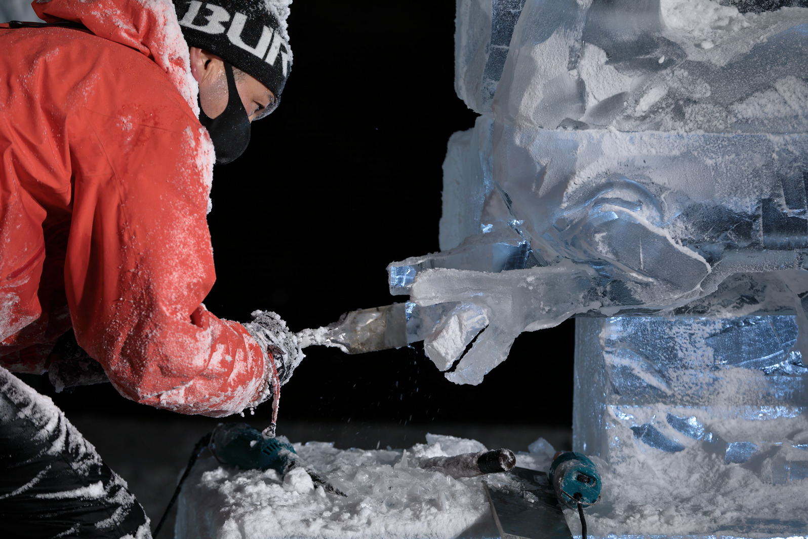 氷像下部をノミで彫り込んでいく。