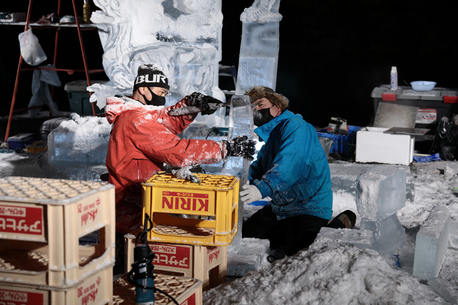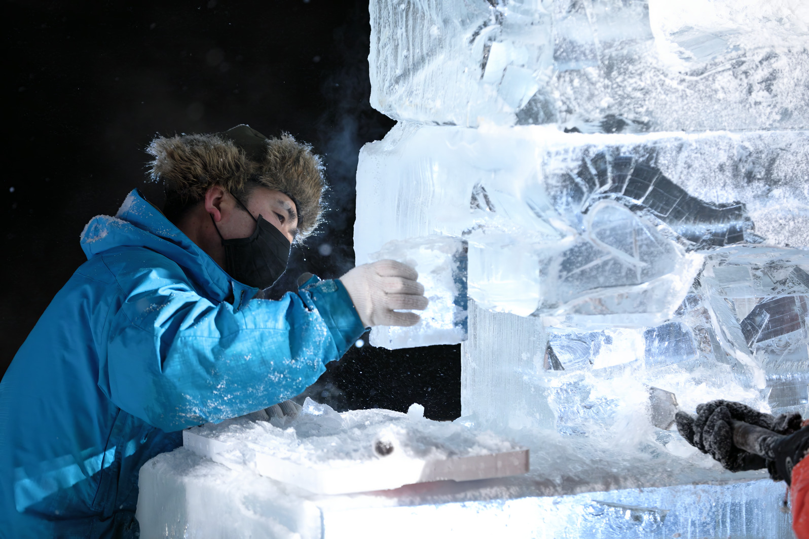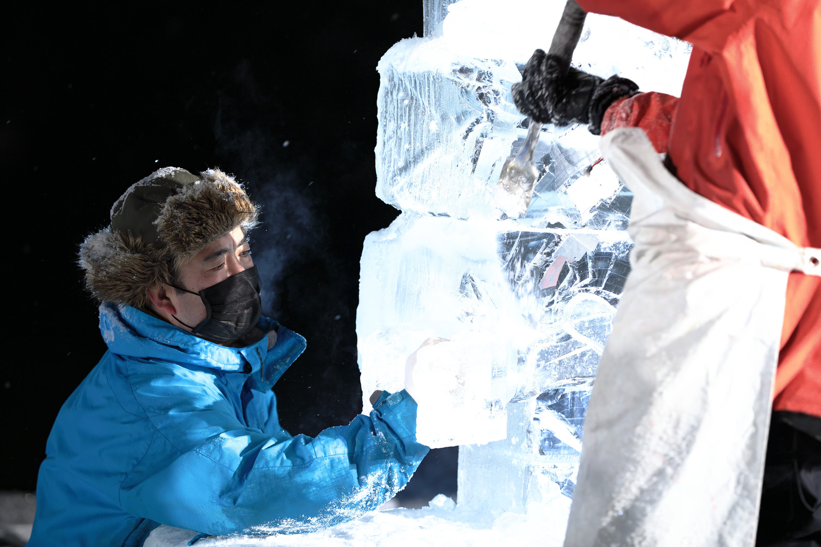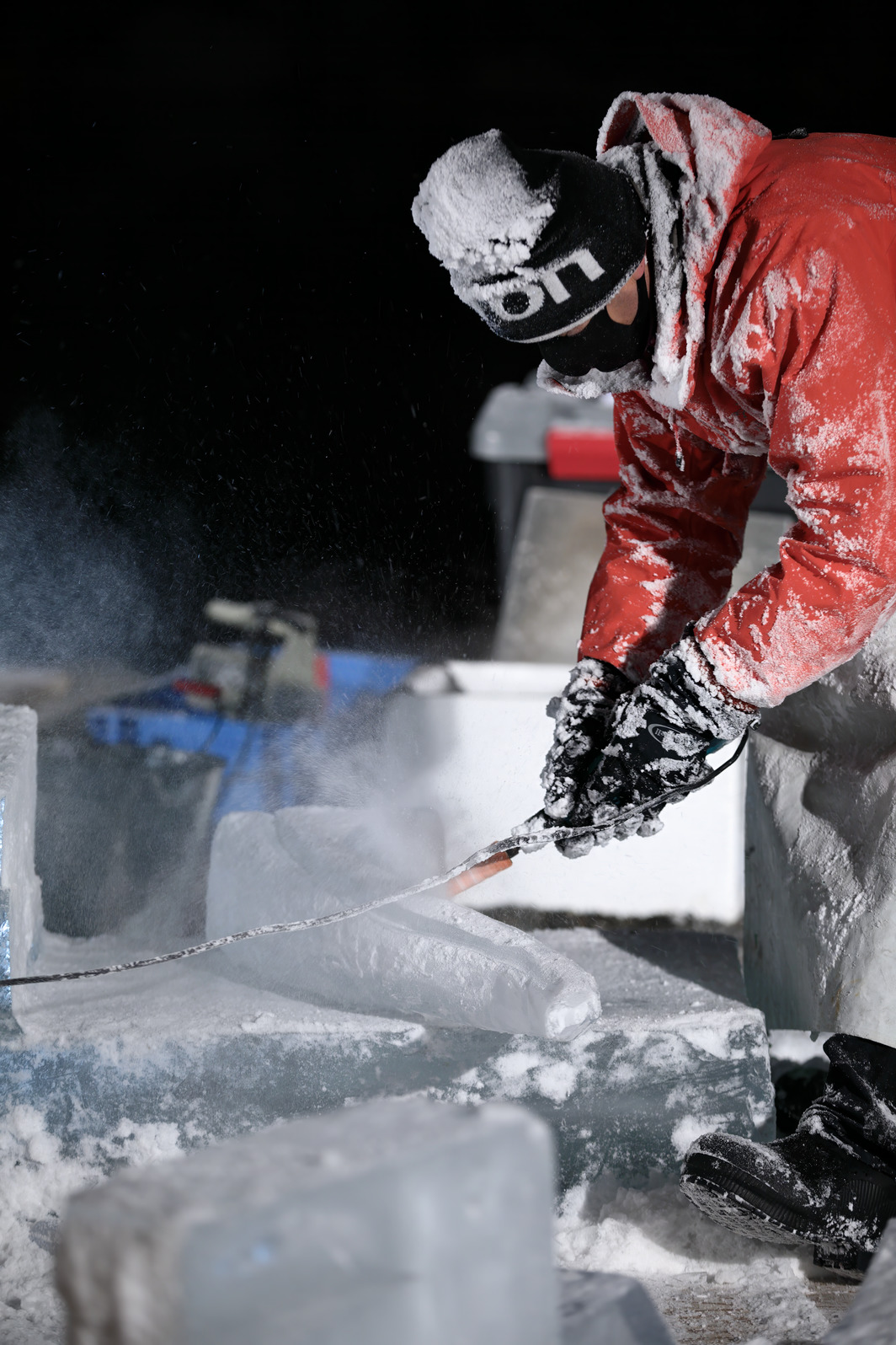 氷像下部をノミで彫り込んでいく。