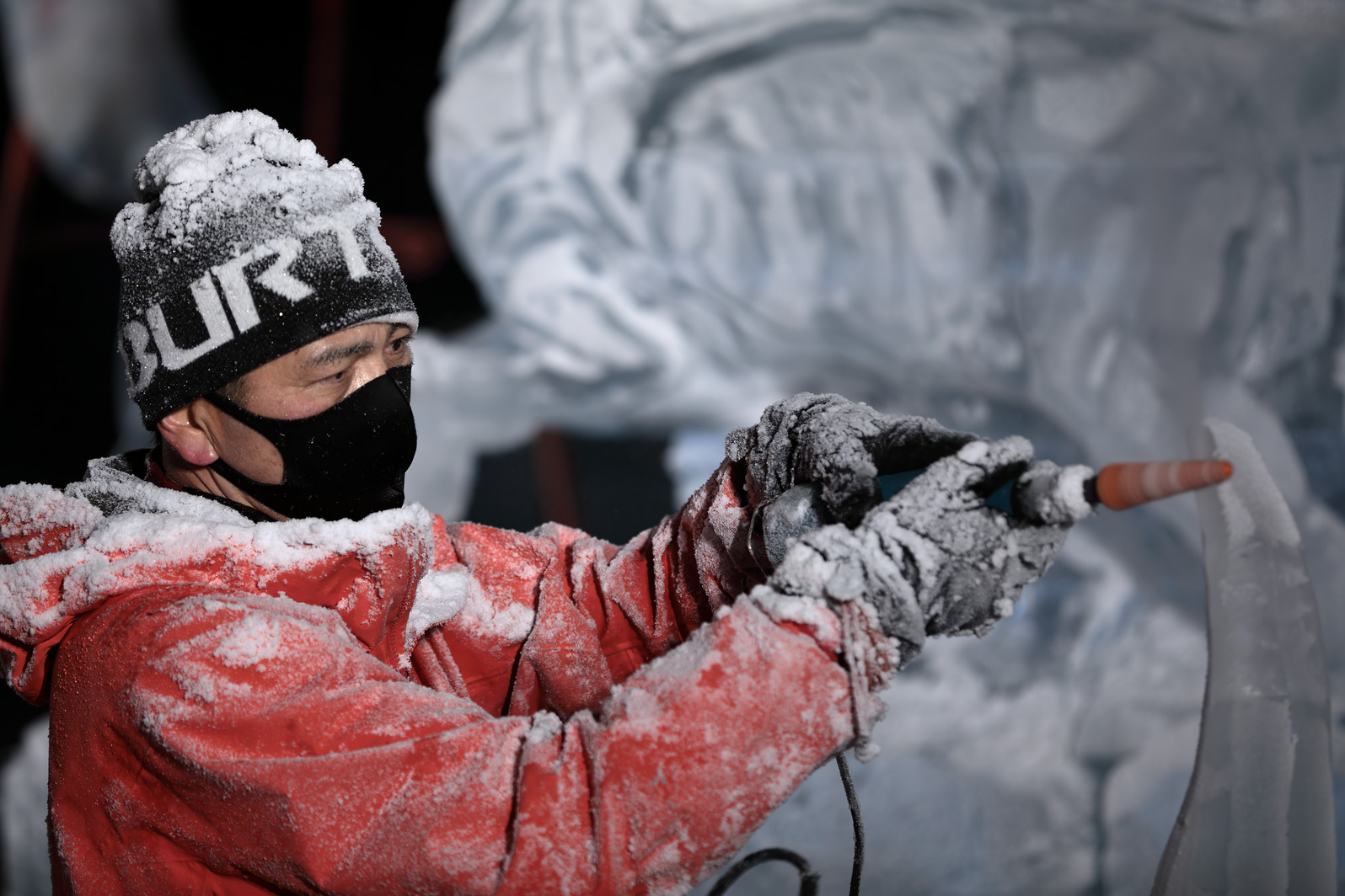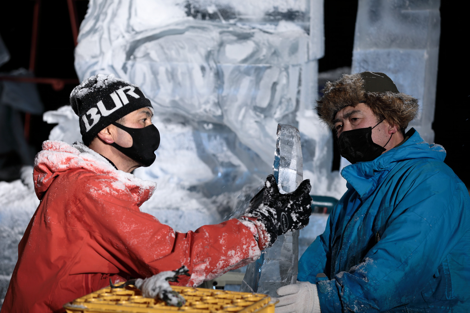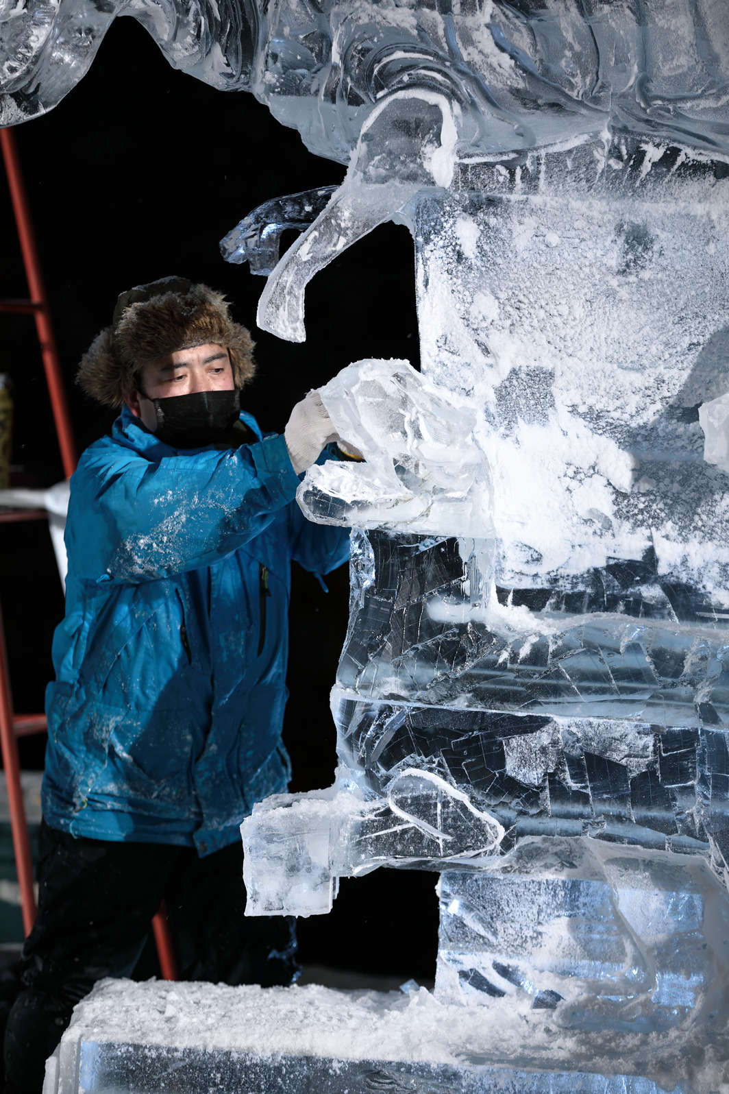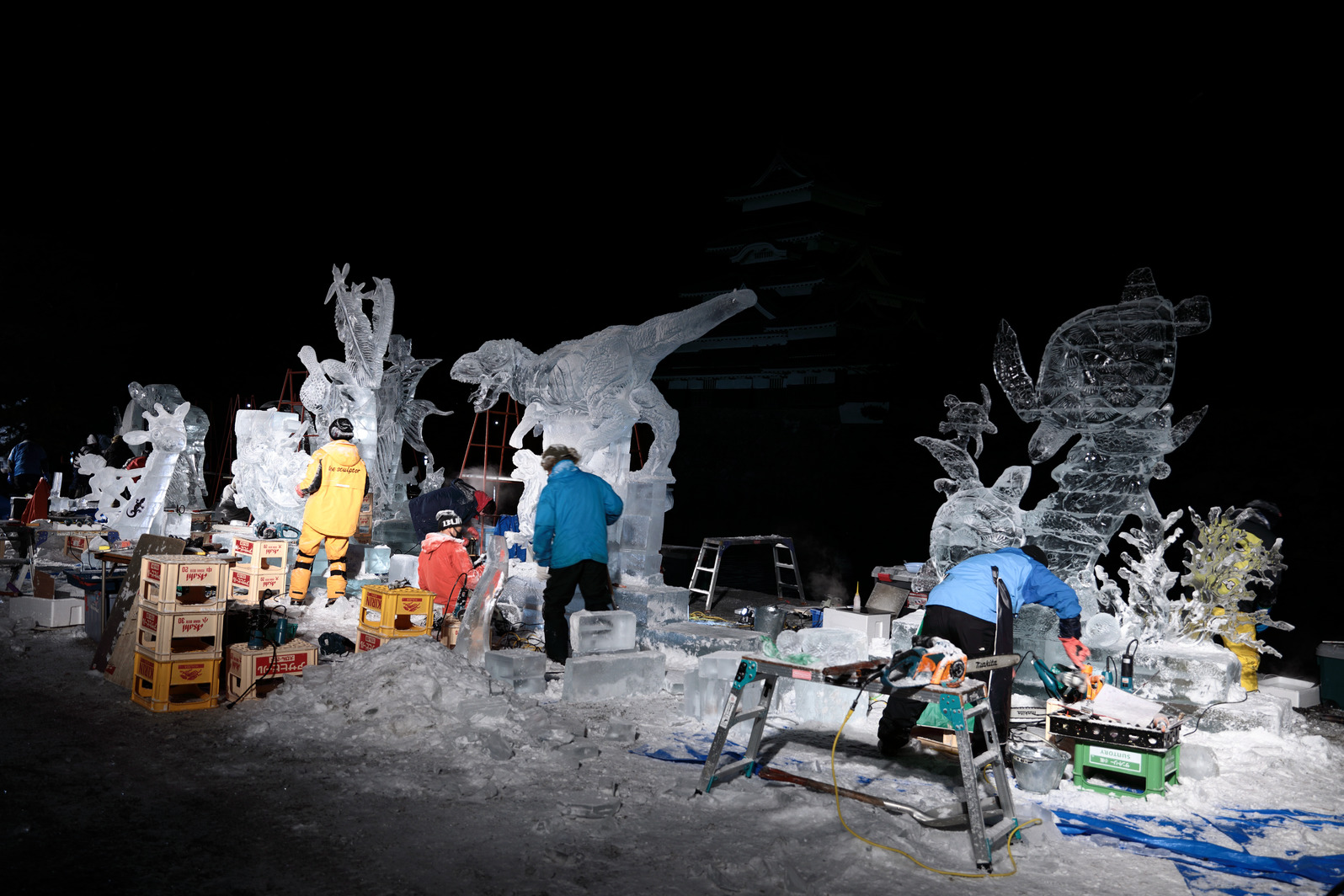 氷像下部をノミで彫り込んでいく。