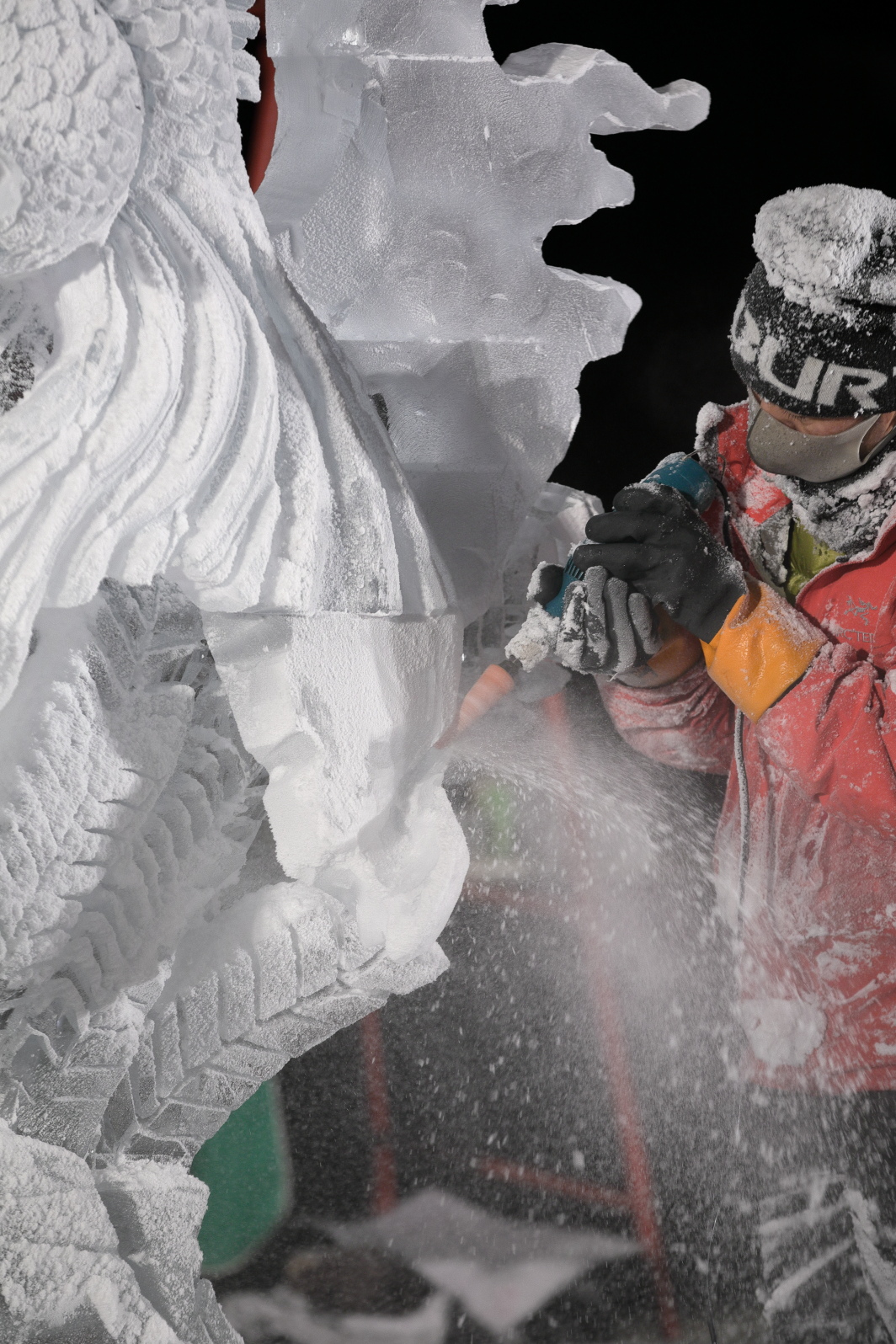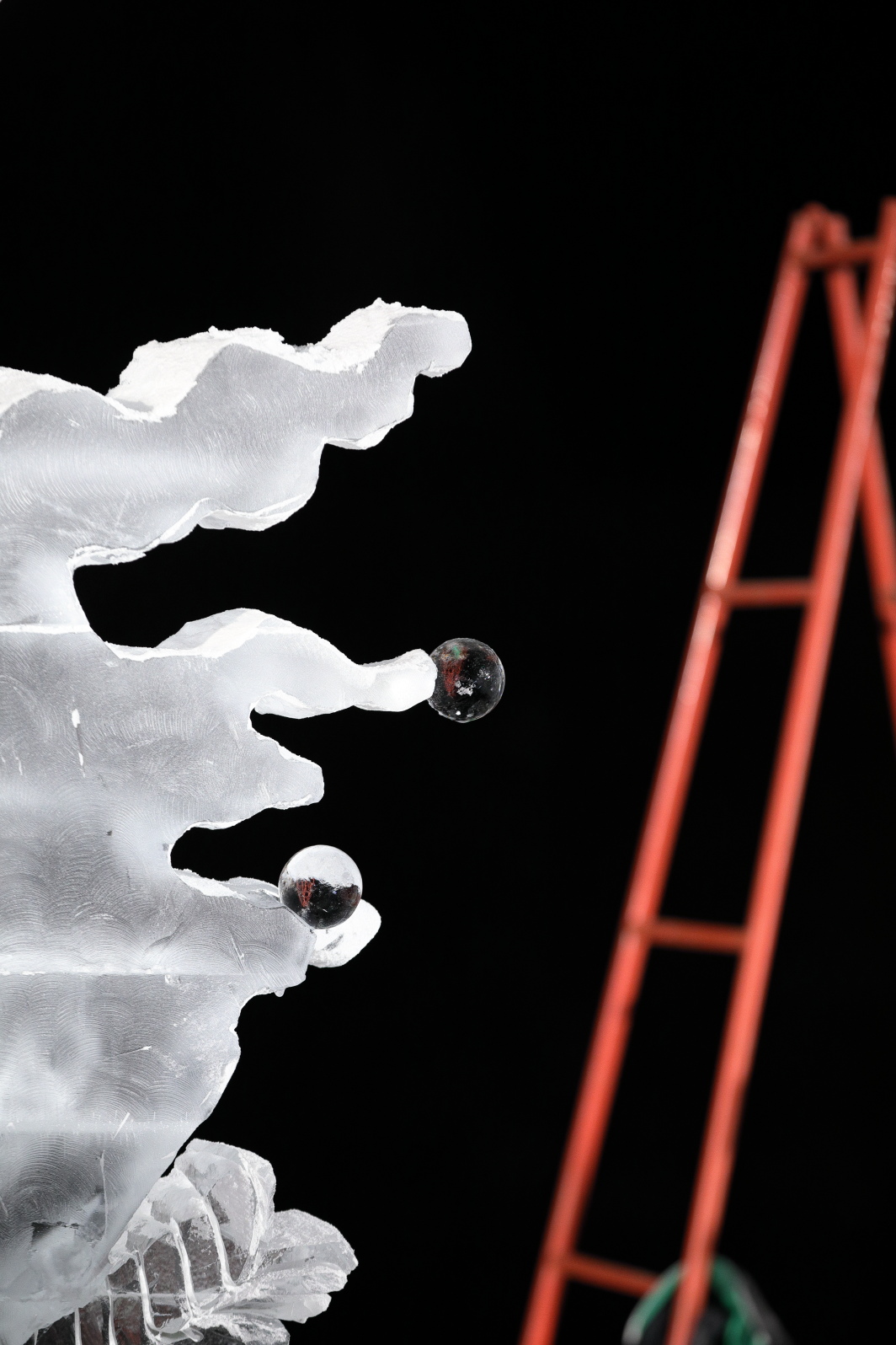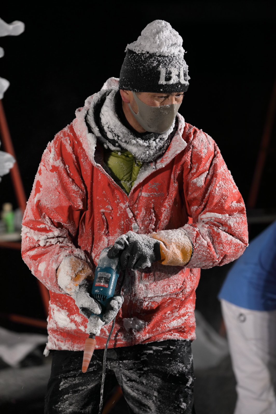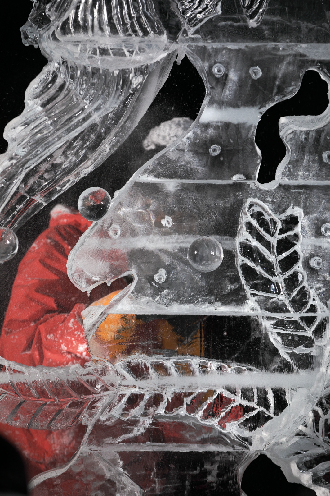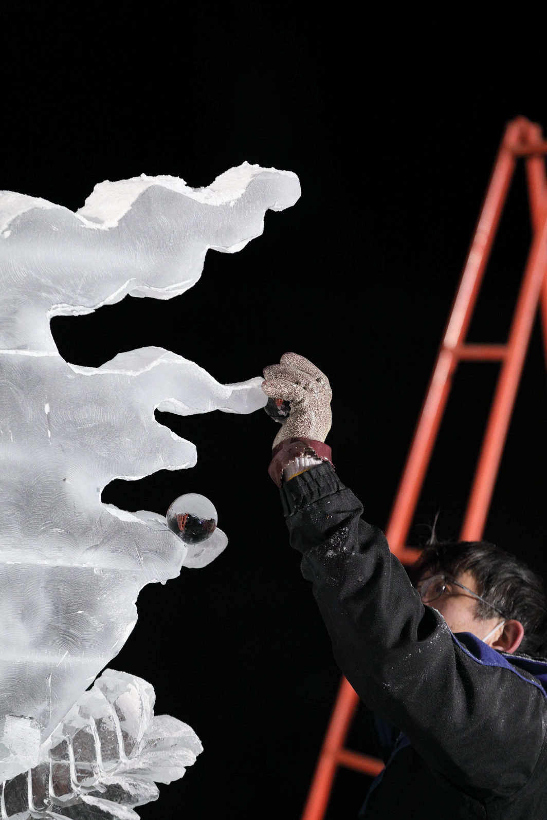 氷像の表面にまん丸に削った氷を取り付け始める。