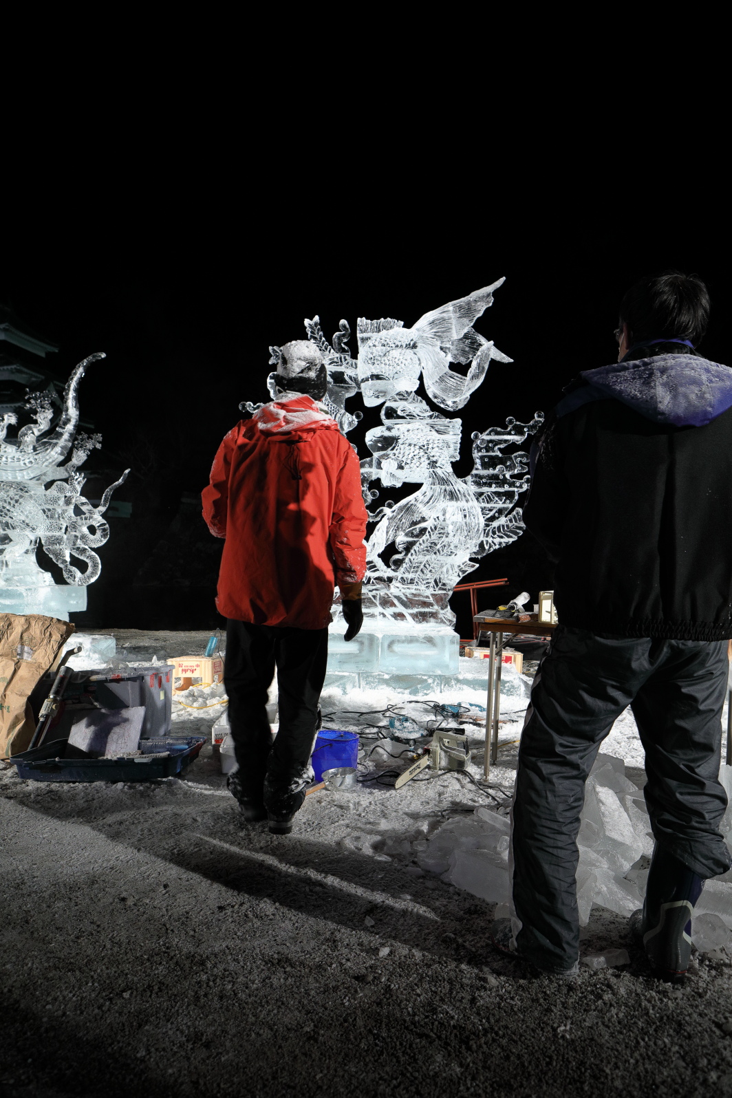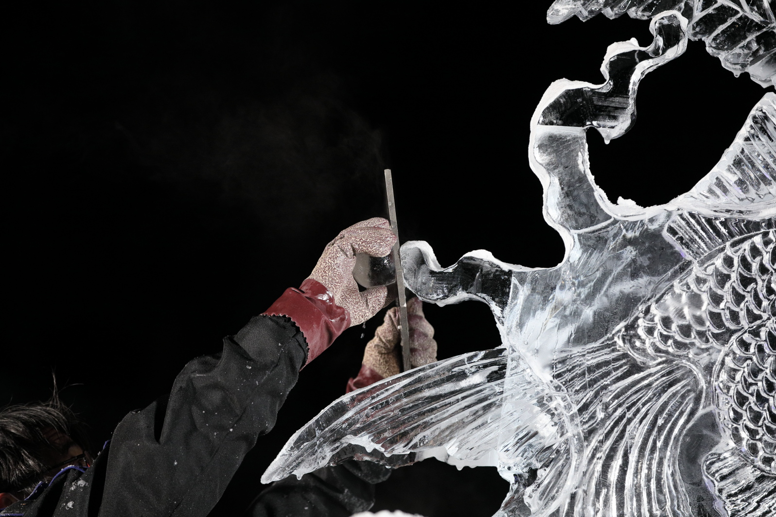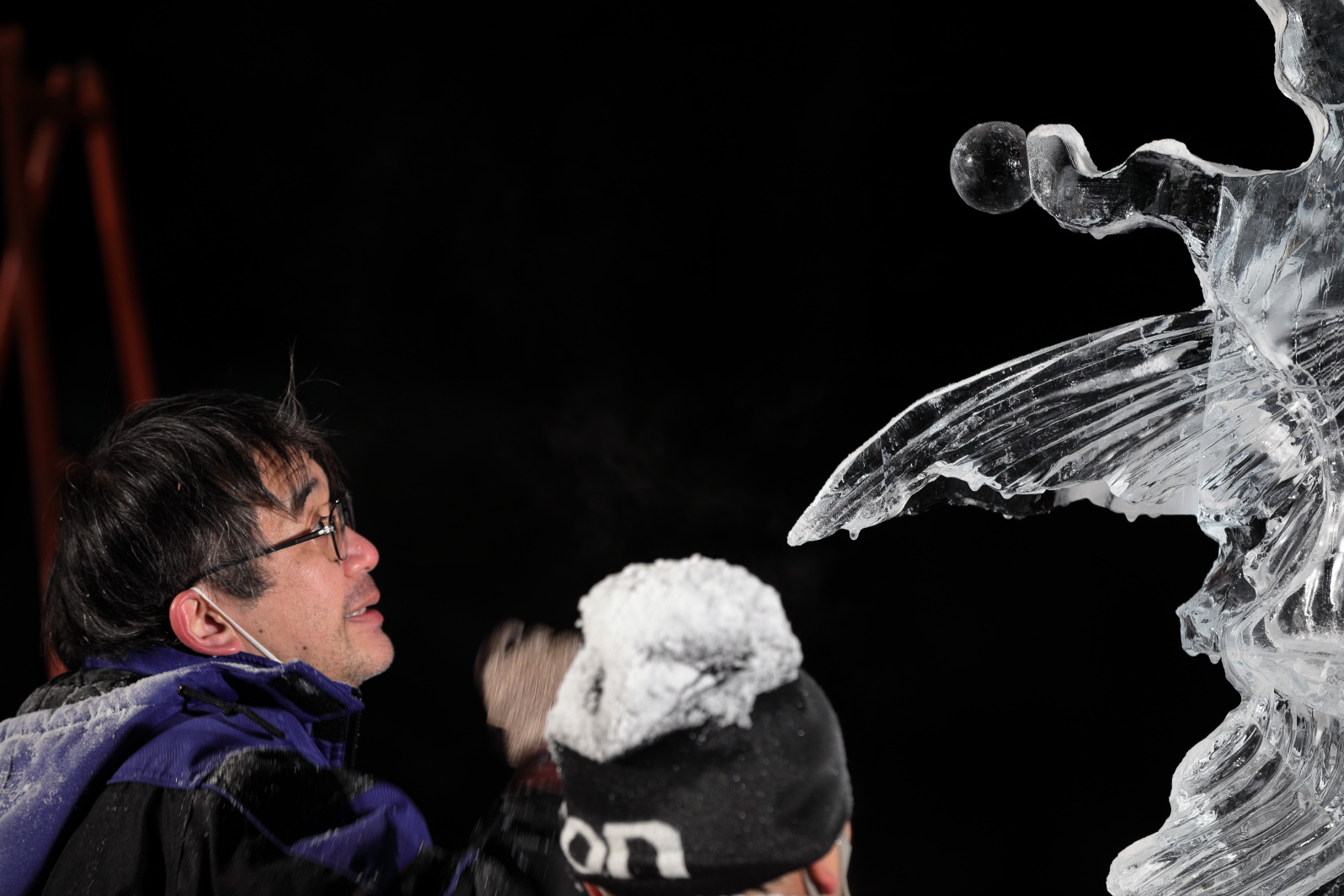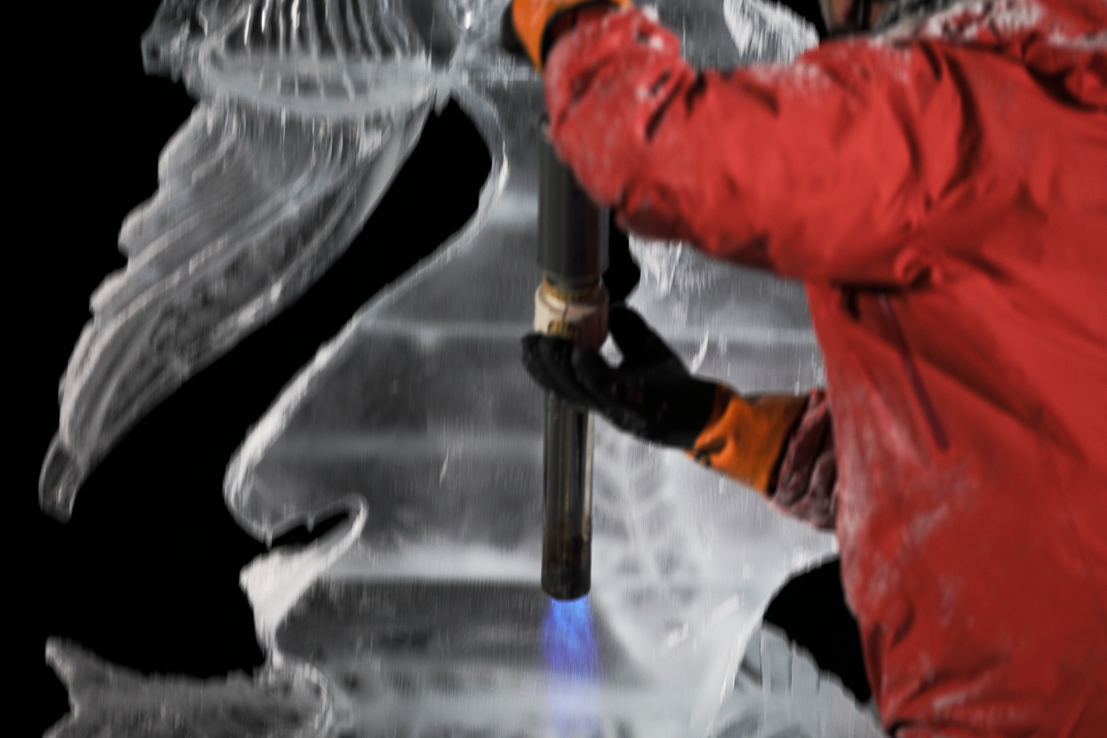 氷像の表面にまん丸に削った氷を取り付け始める。