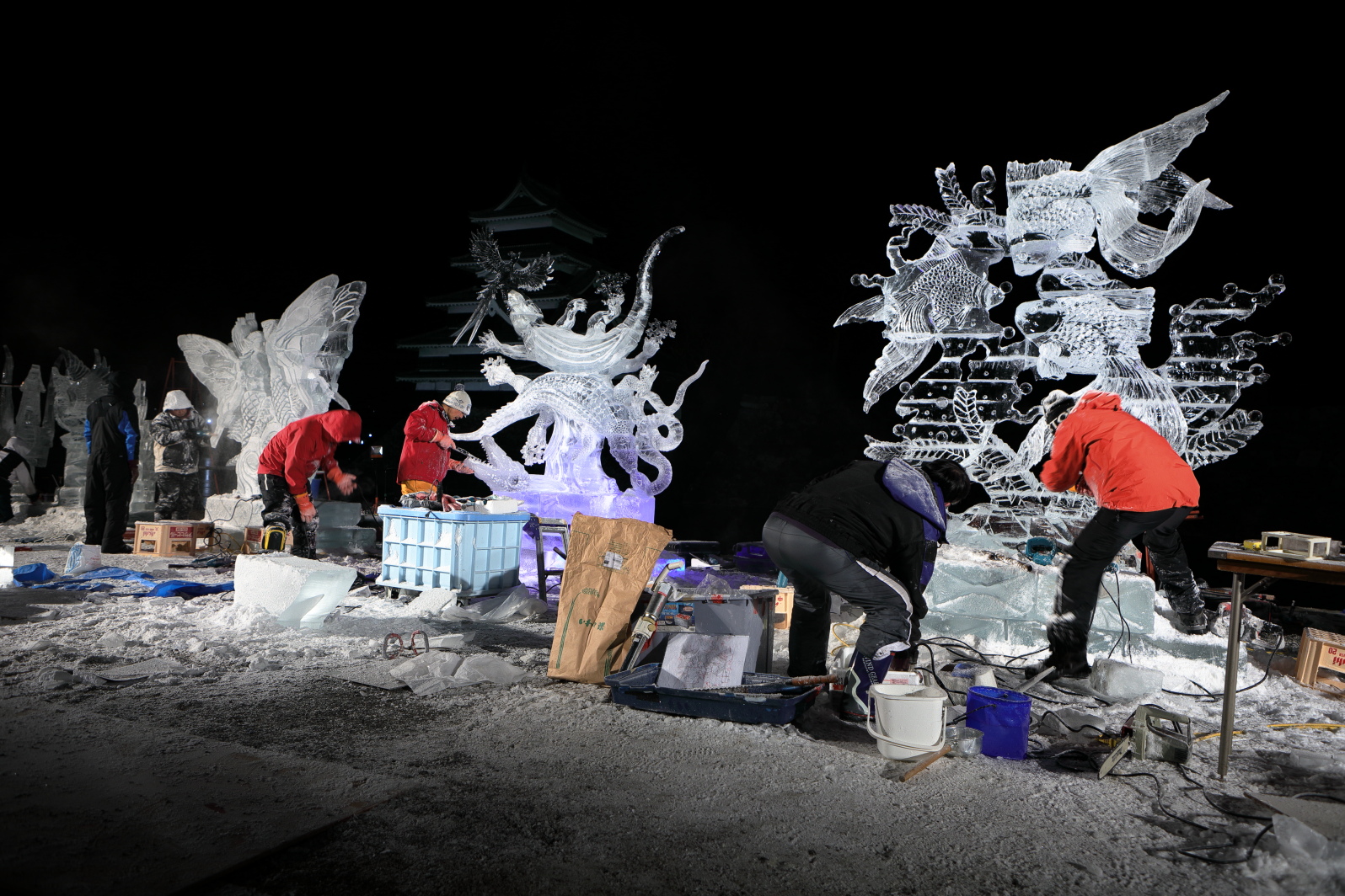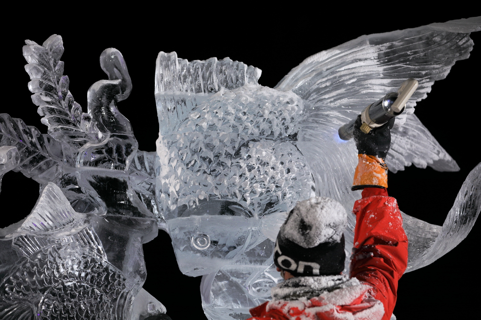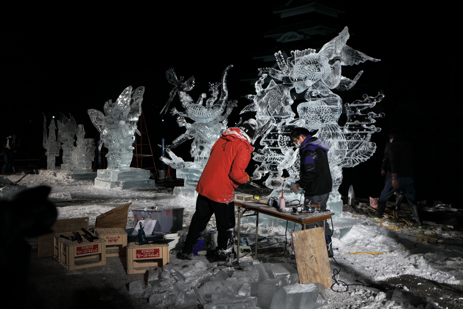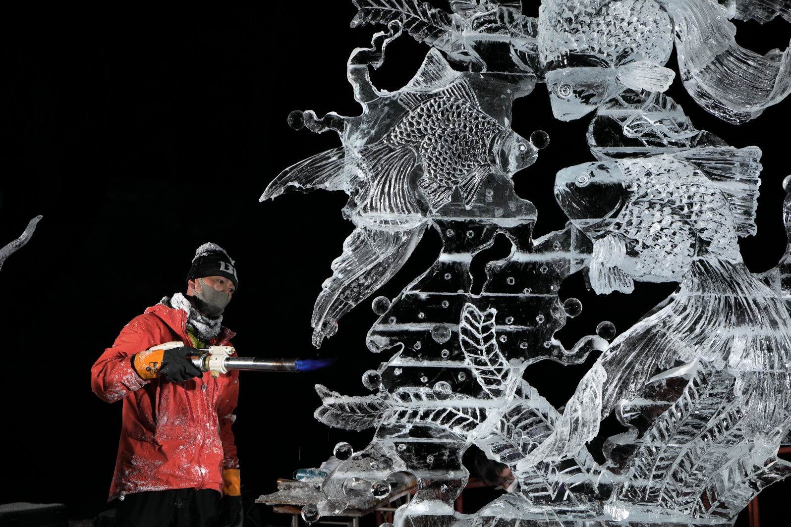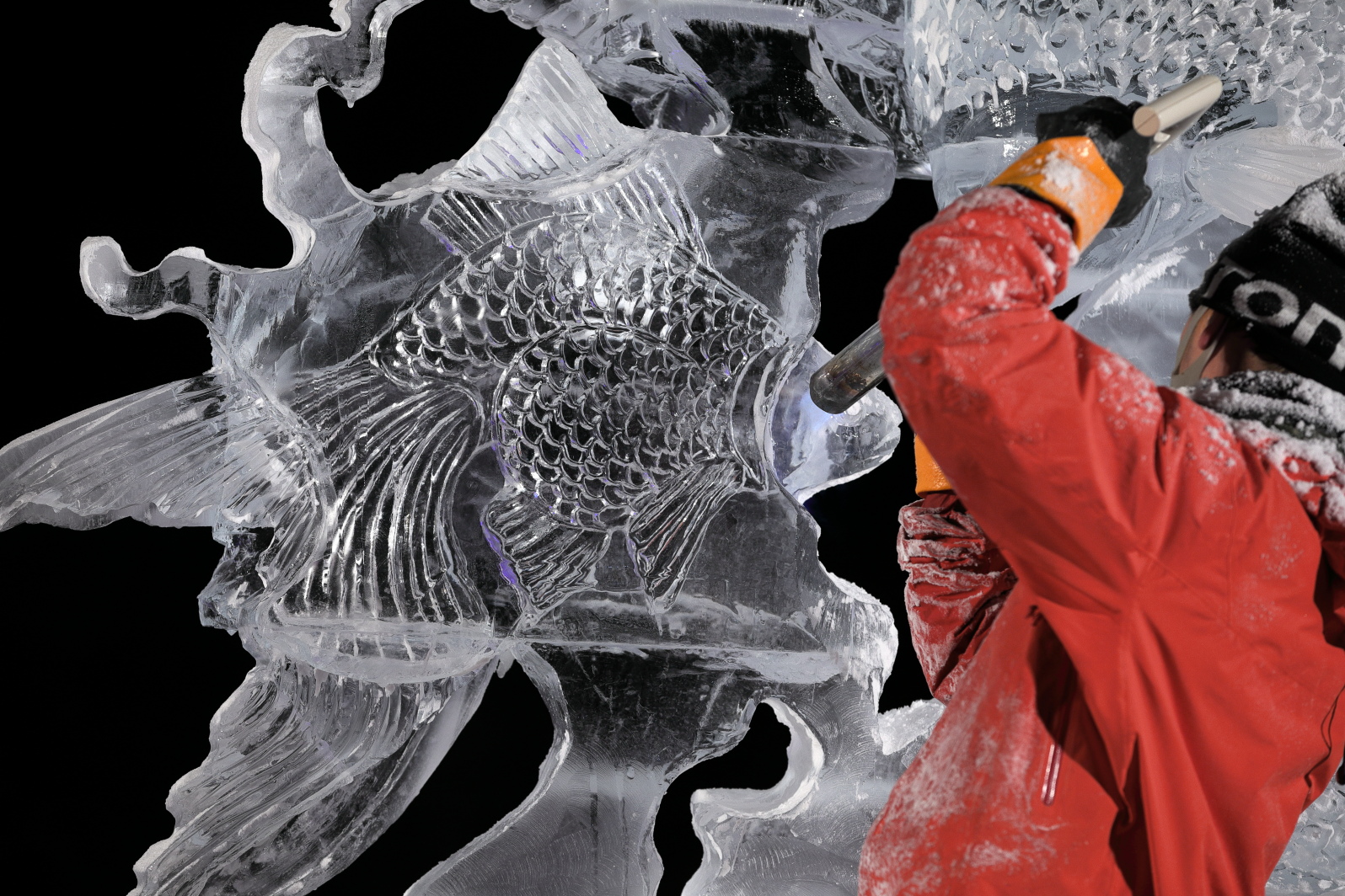 氷像の表面にまん丸に削った氷を取り付け始める。