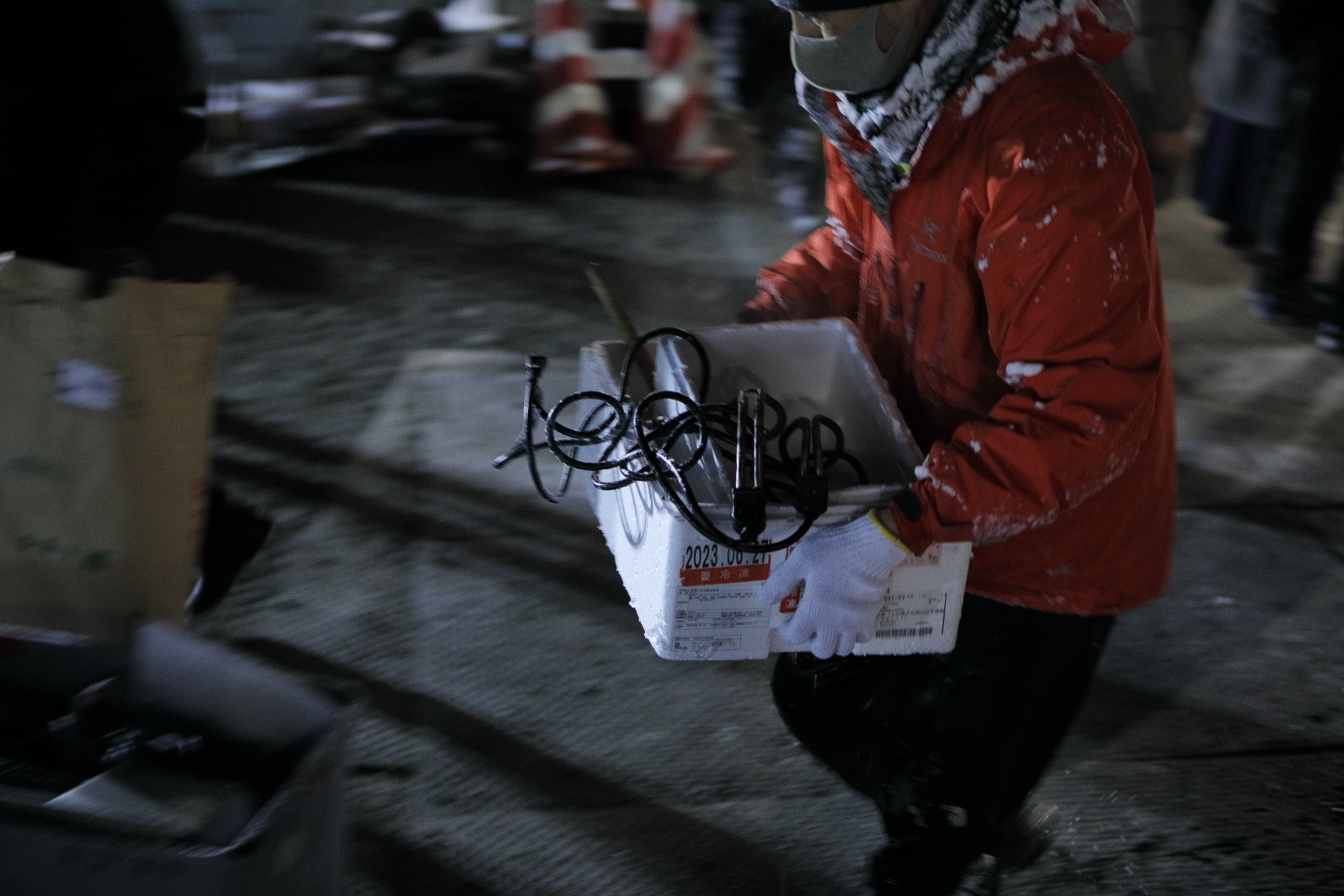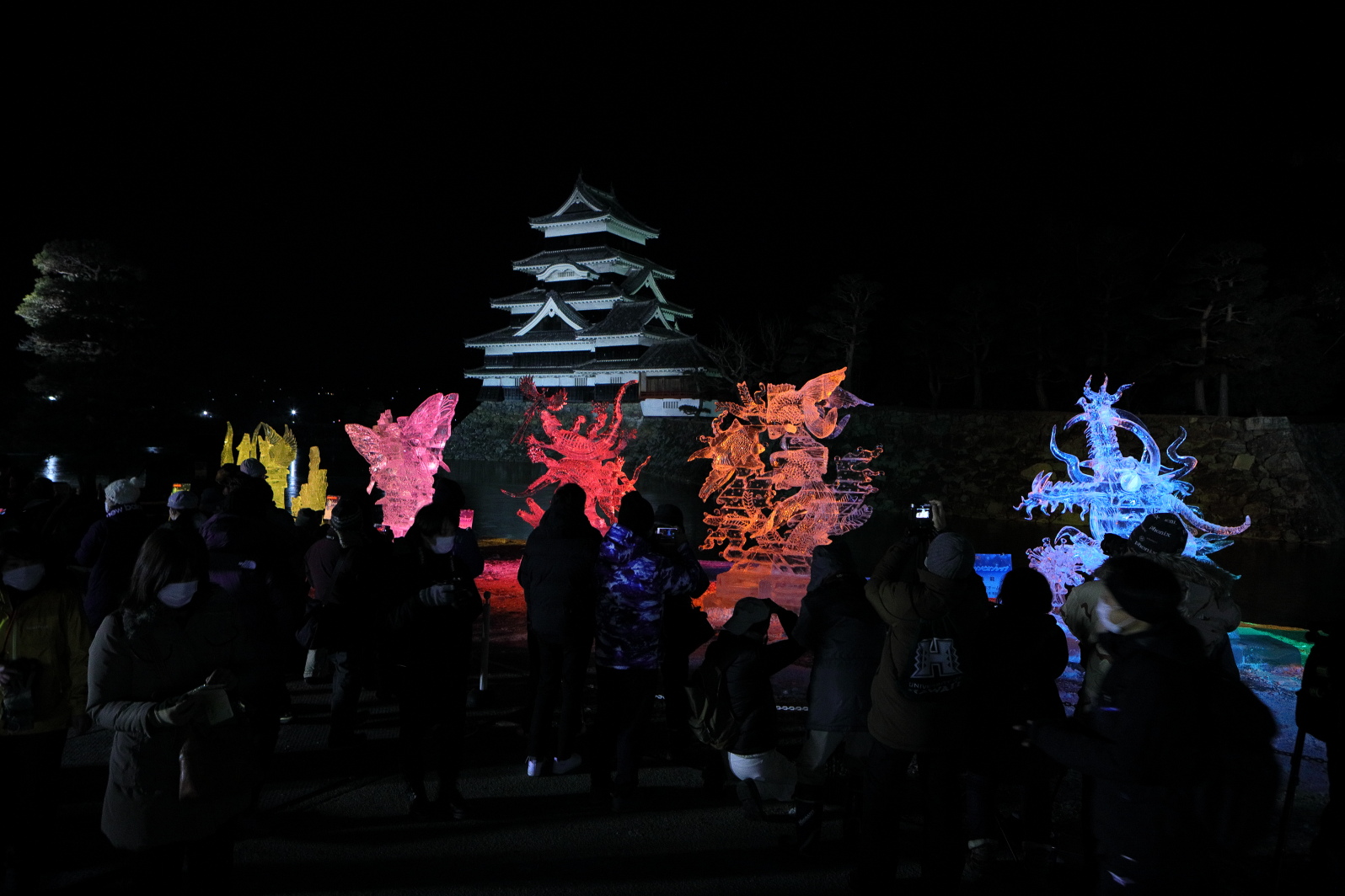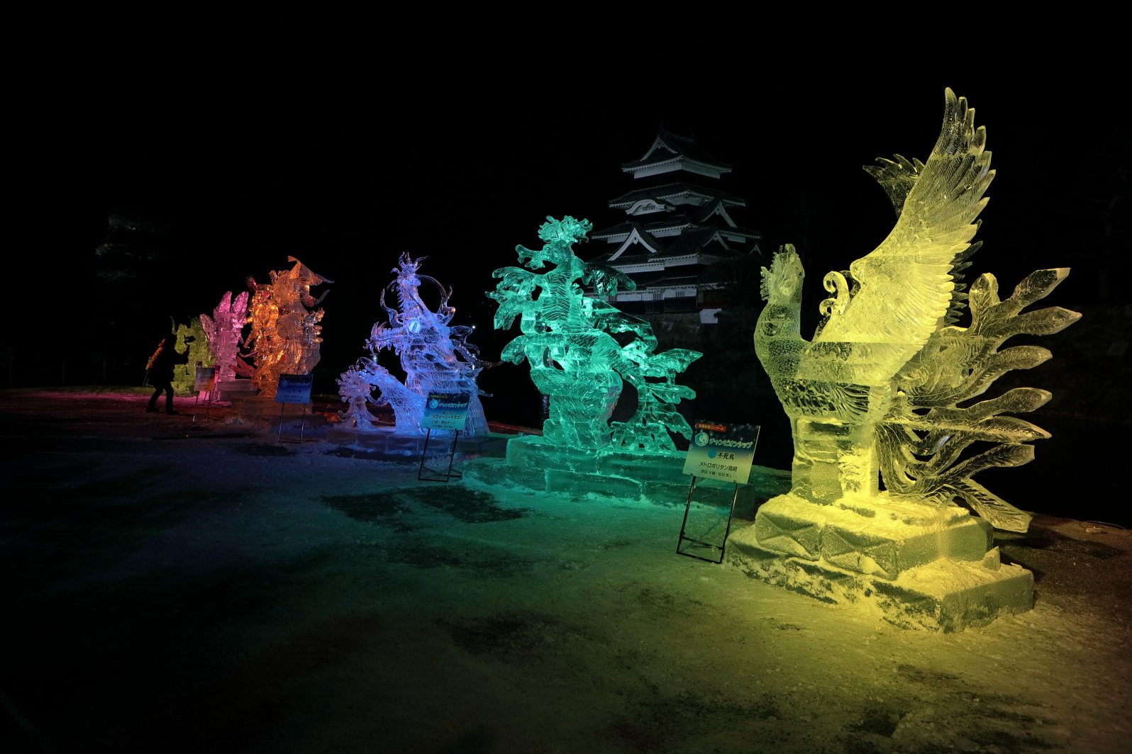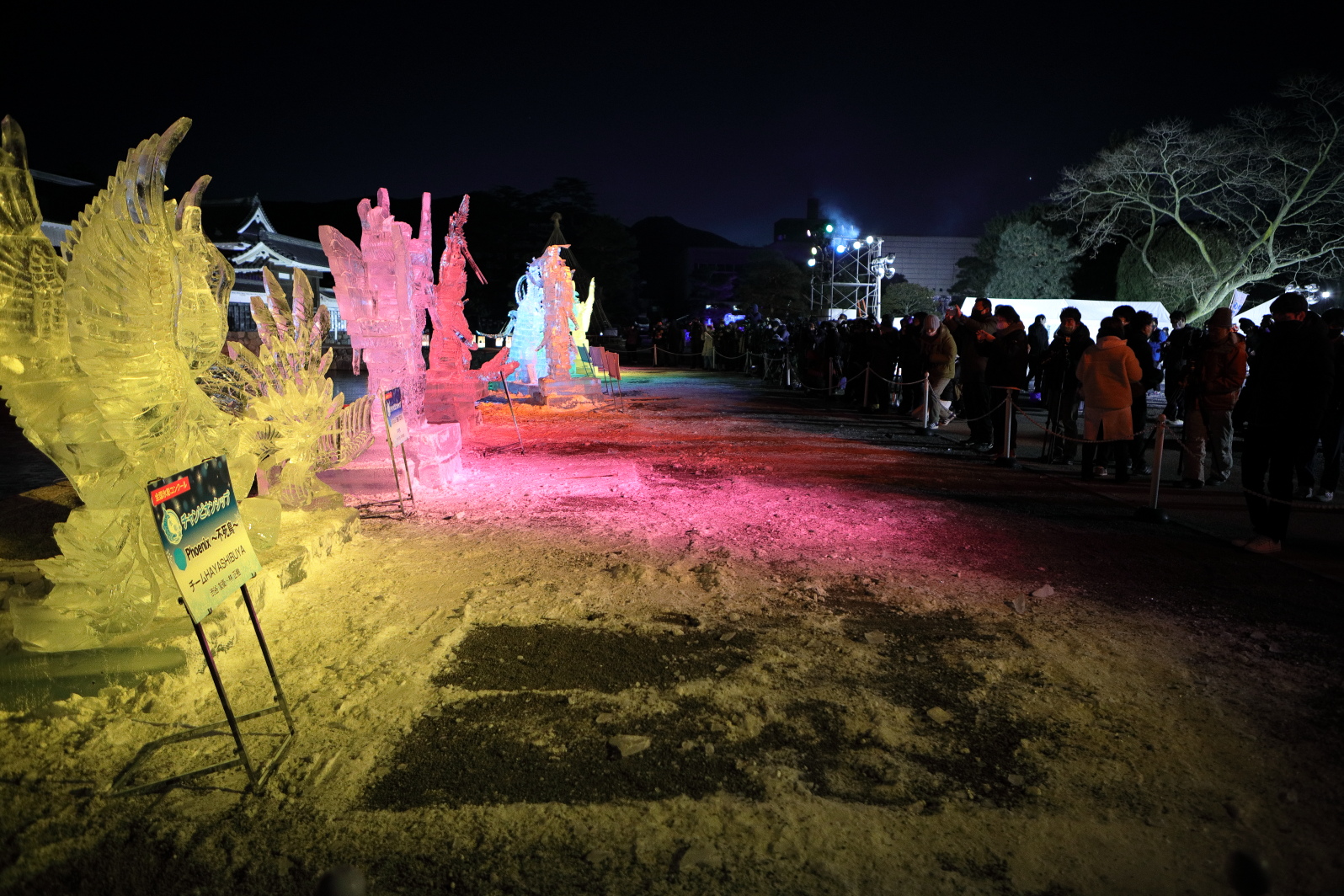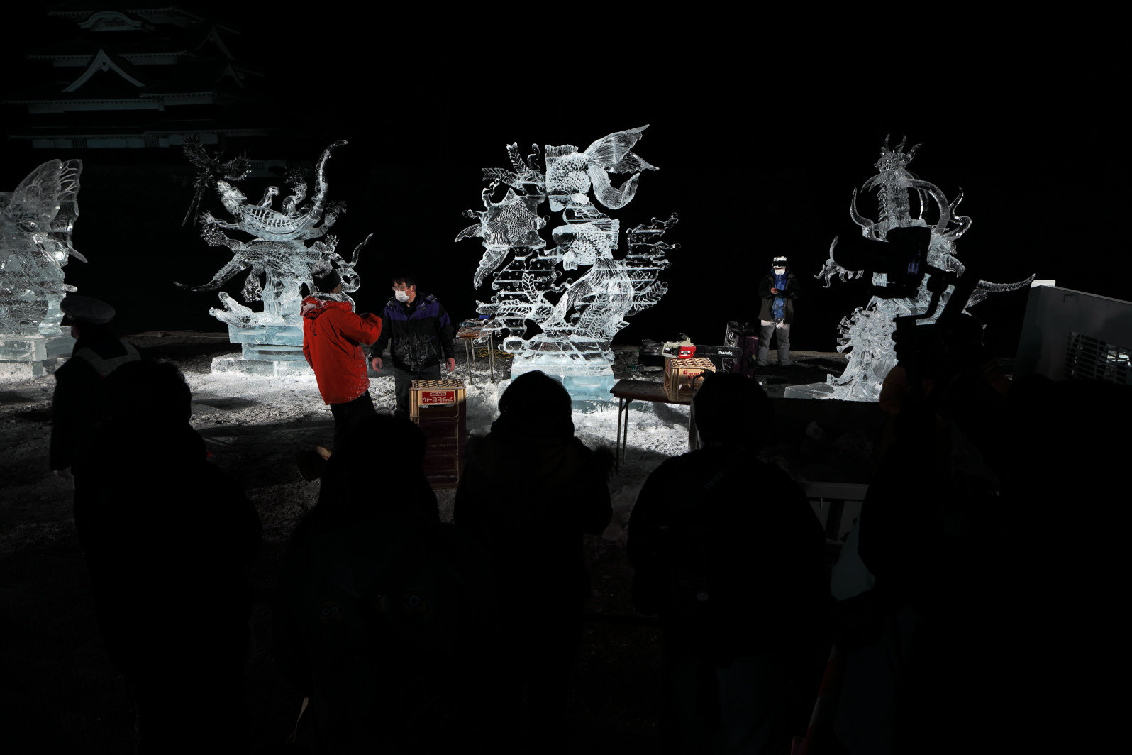 氷像の表面にまん丸に削った氷を取り付け始める。