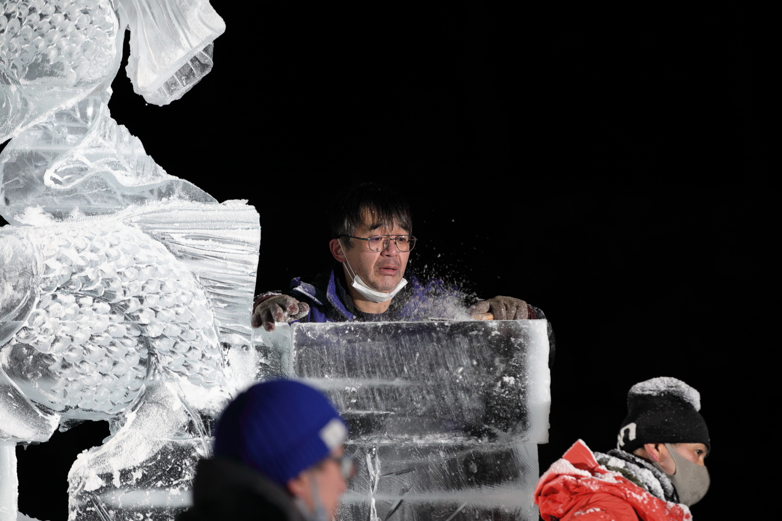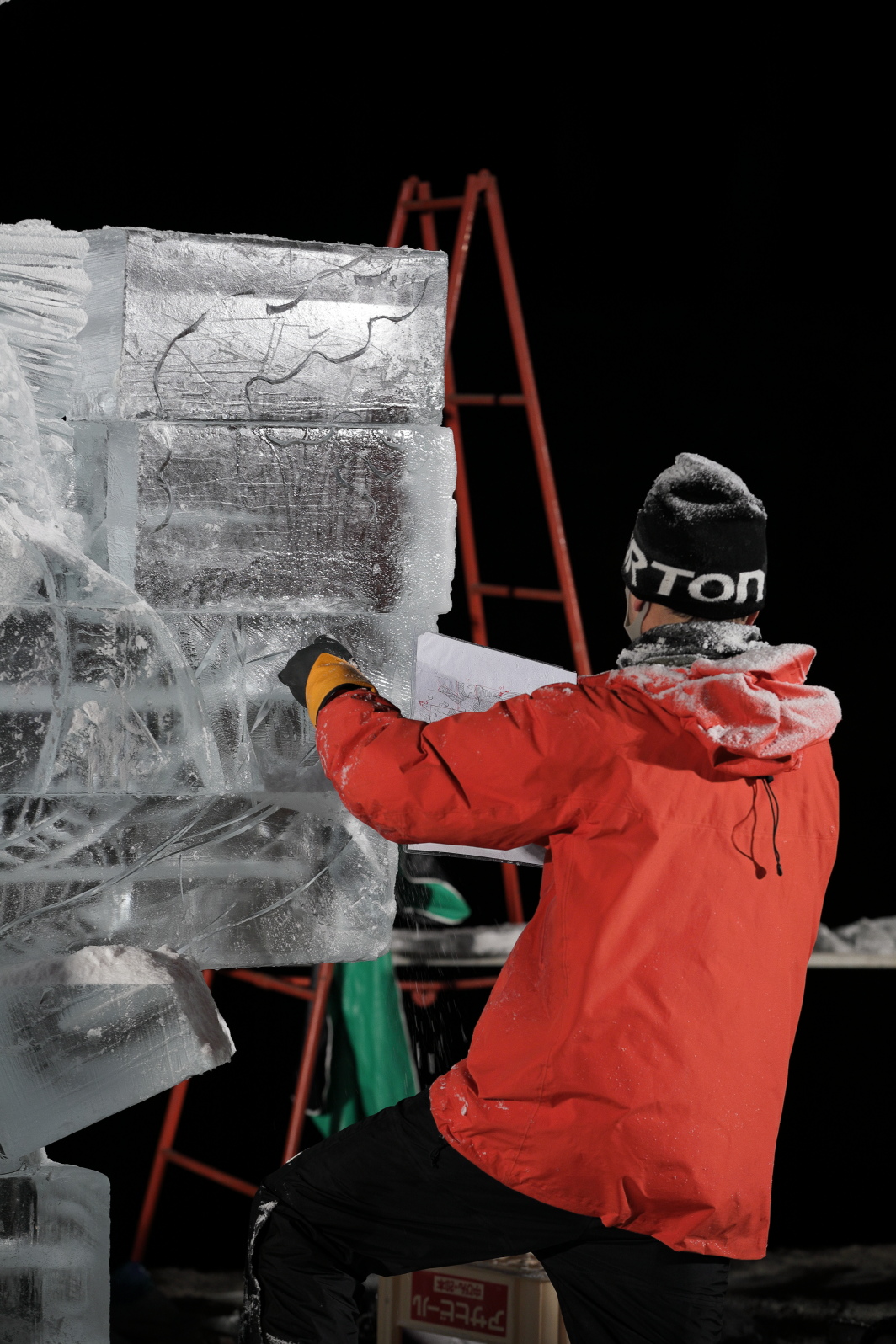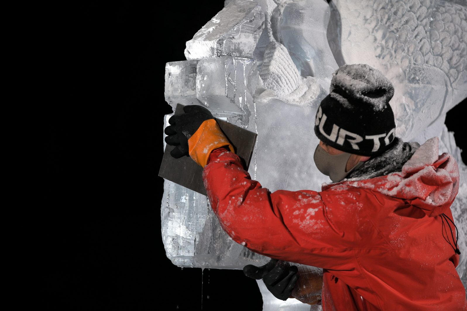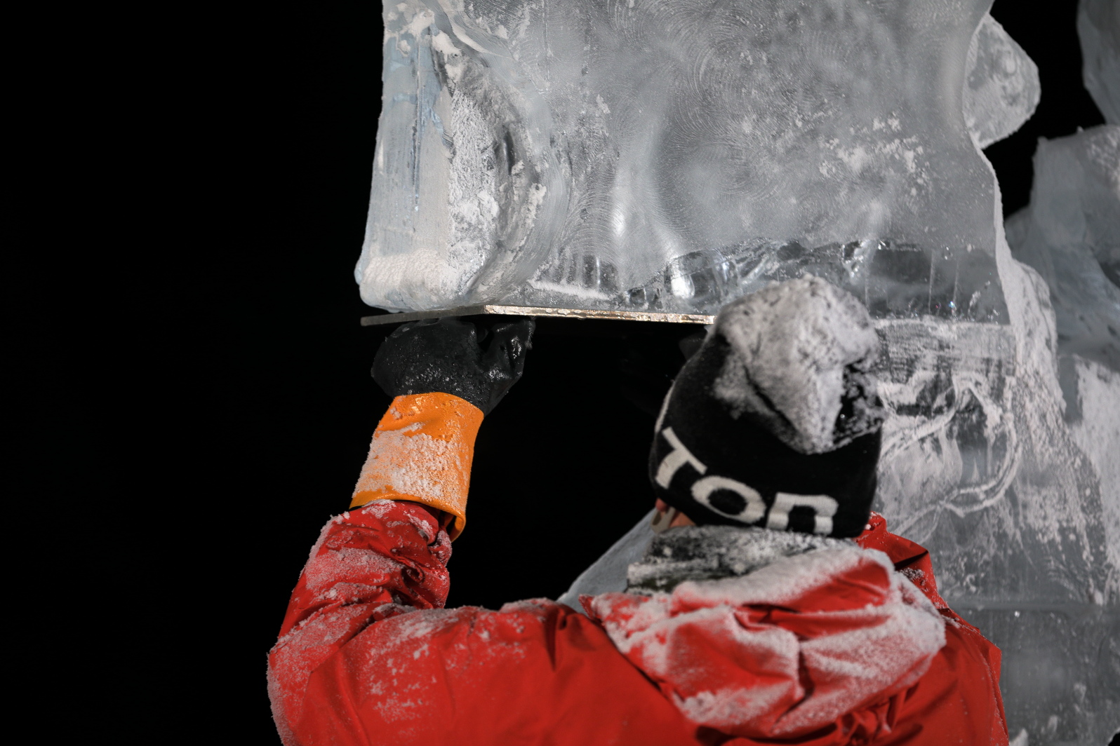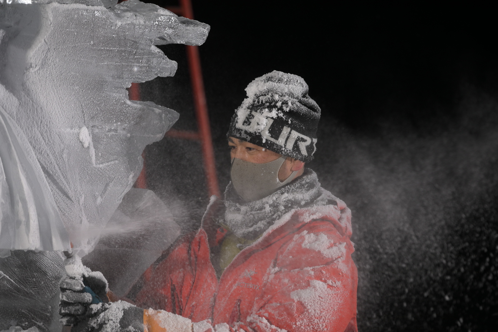 作業で出た氷屑「残氷(ざんぴょう)」の回収が入る。