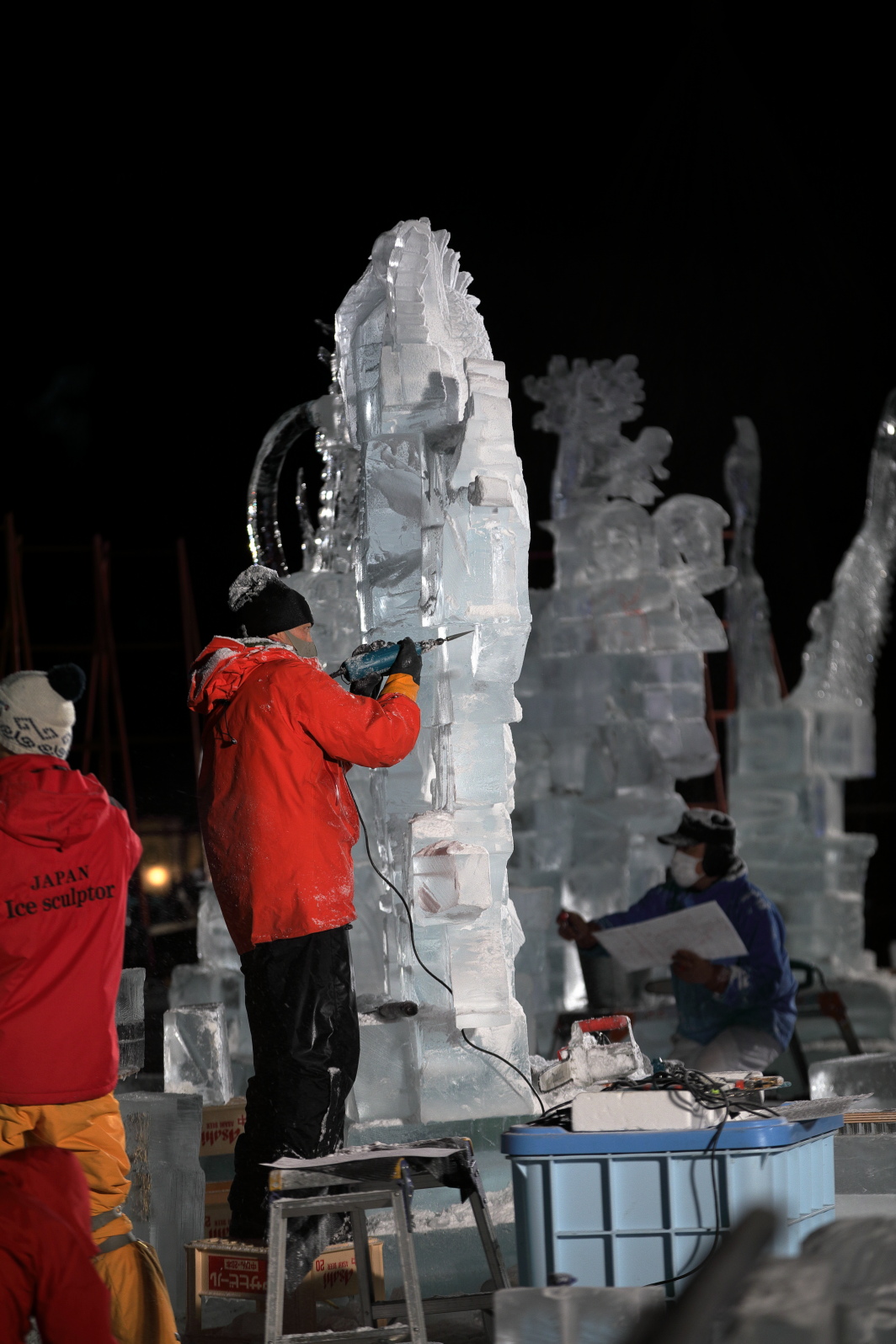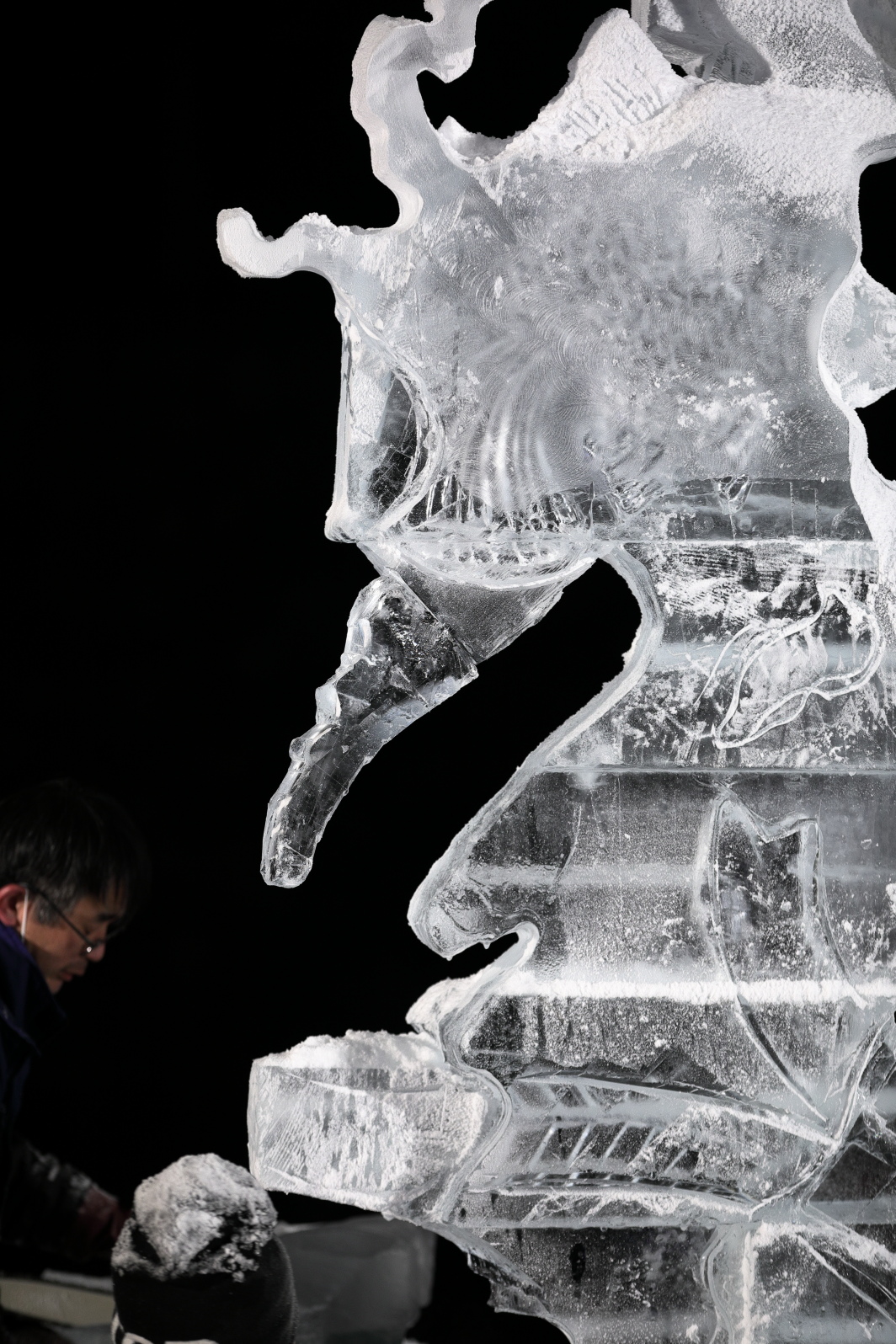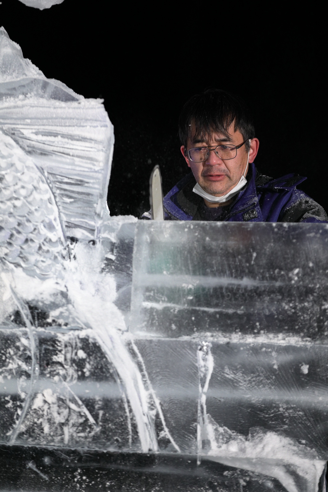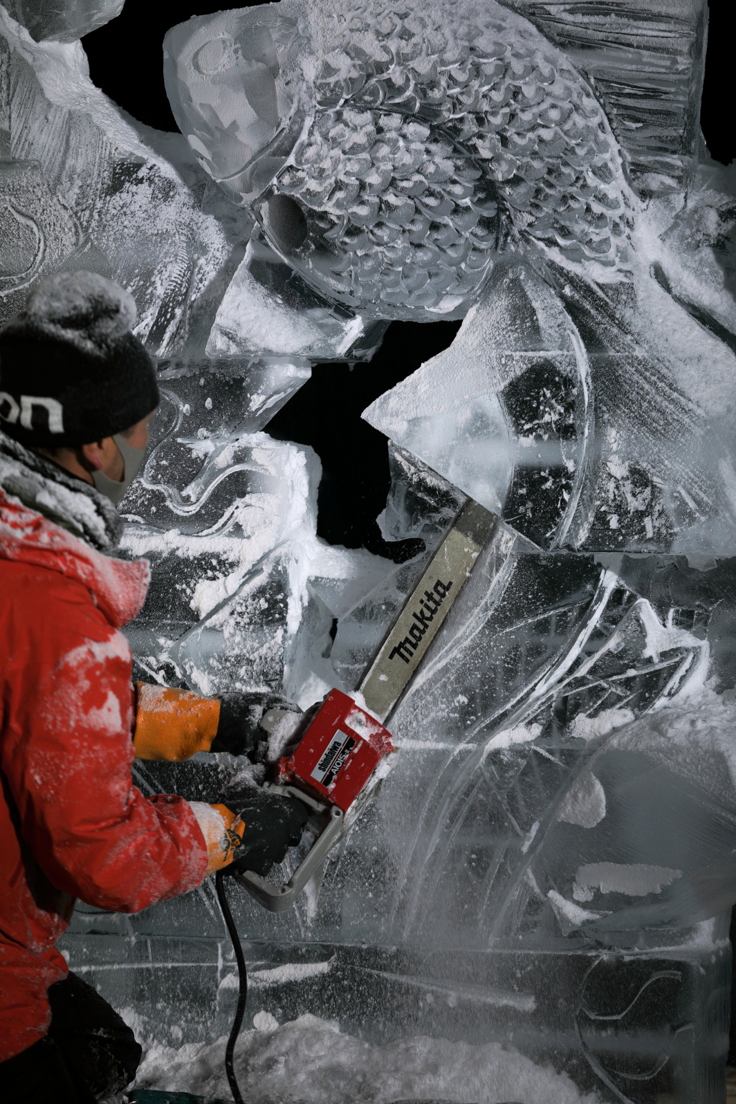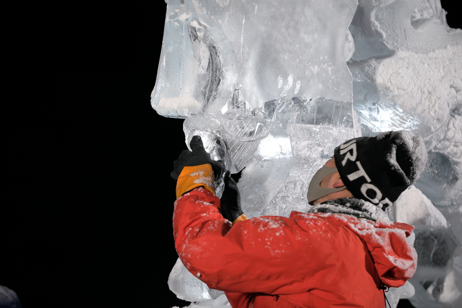 作業で出た氷屑「残氷(ざんぴょう)」の回収が入る。