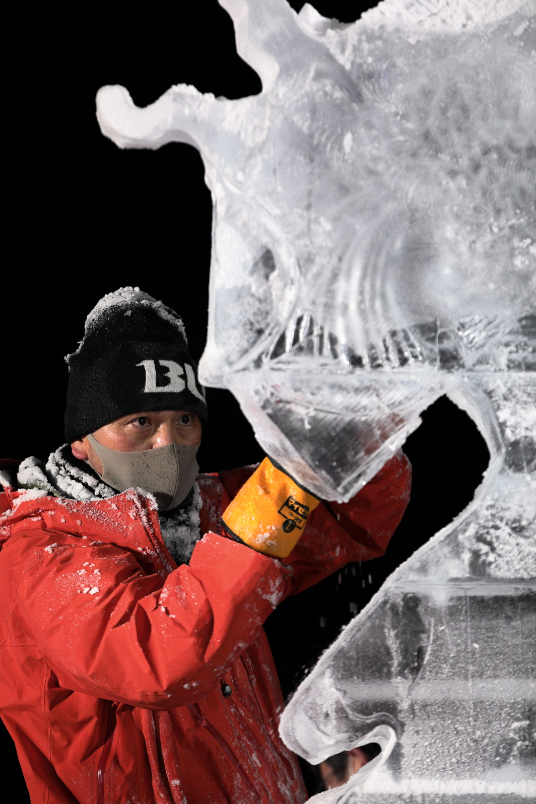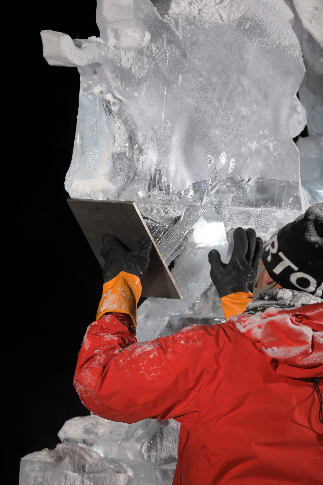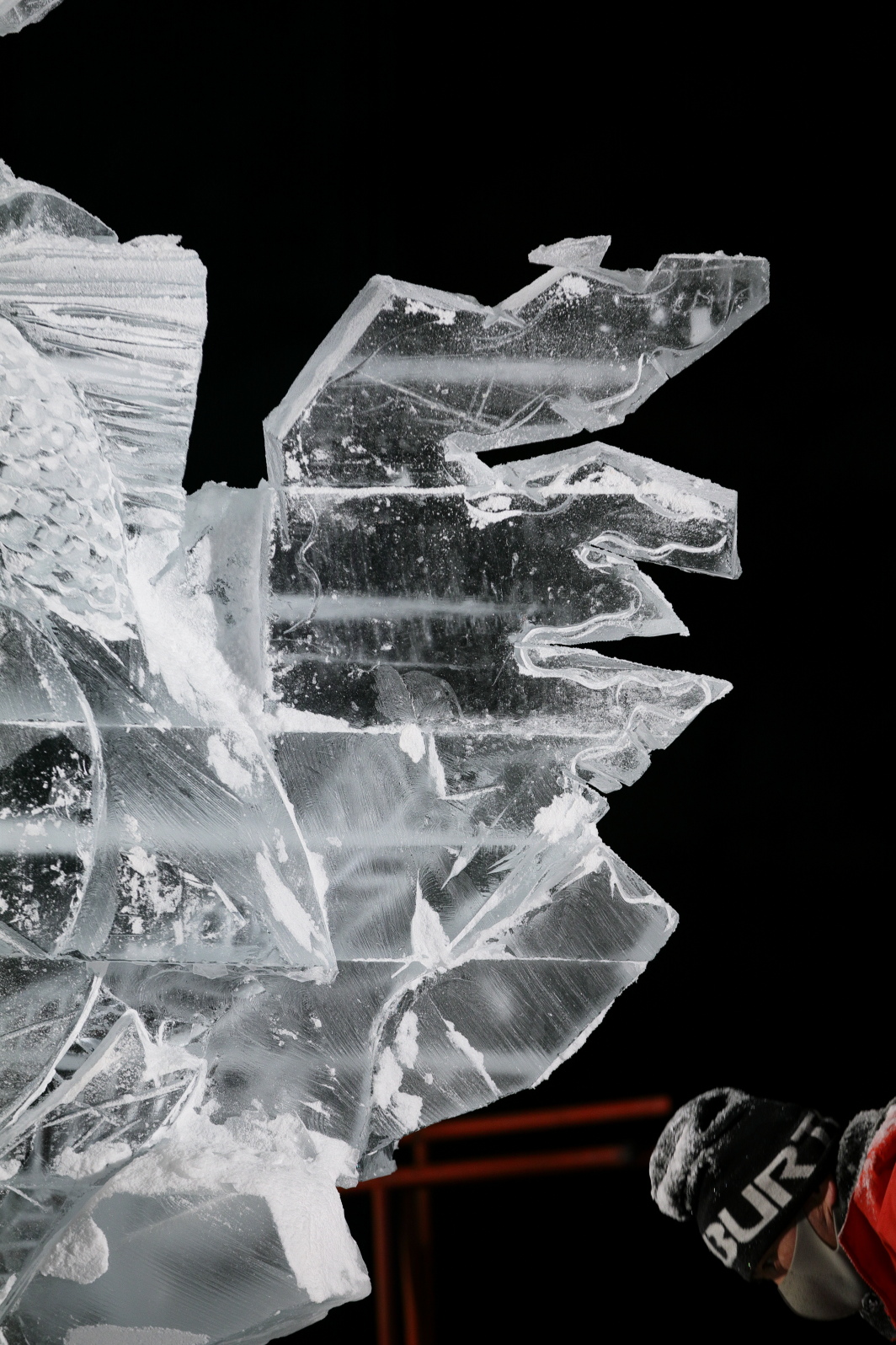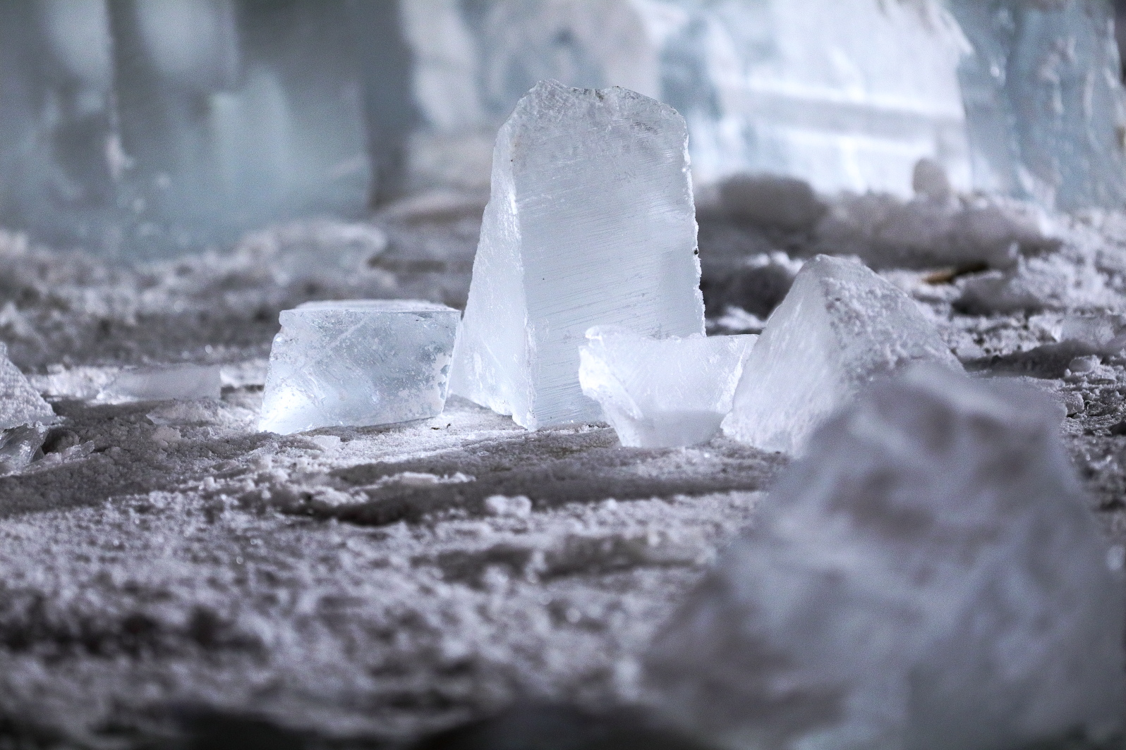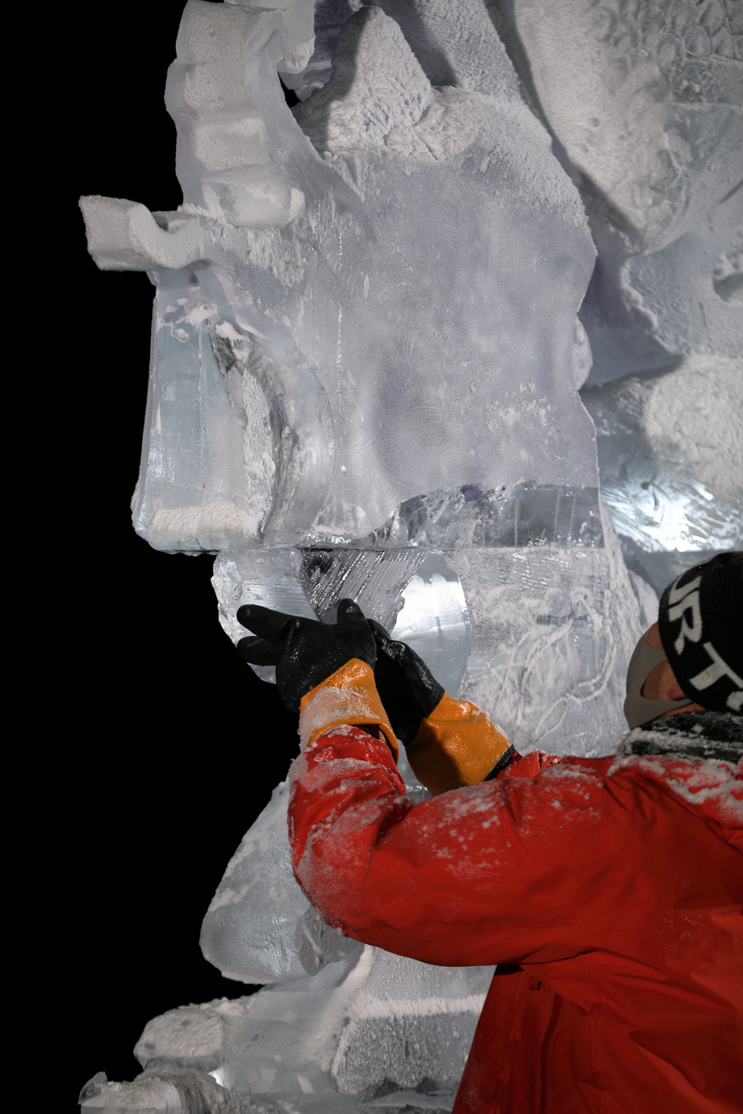 作業で出た氷屑「残氷(ざんぴょう)」の回収が入る。