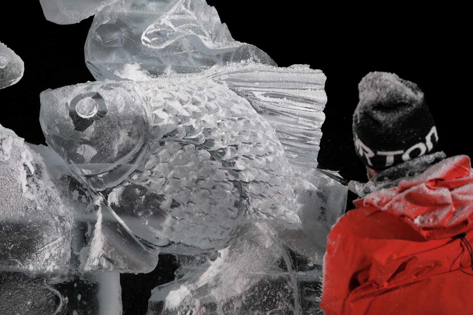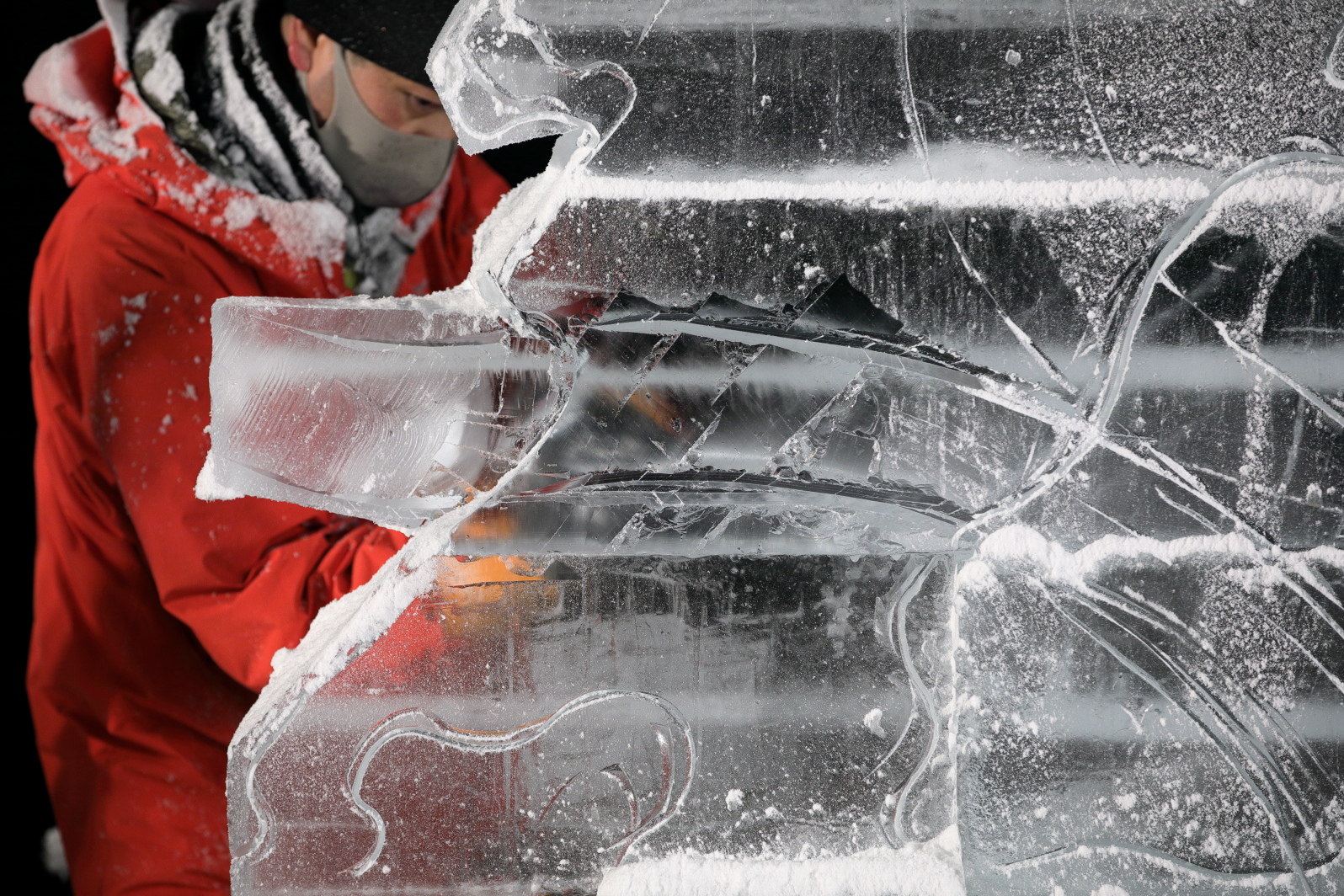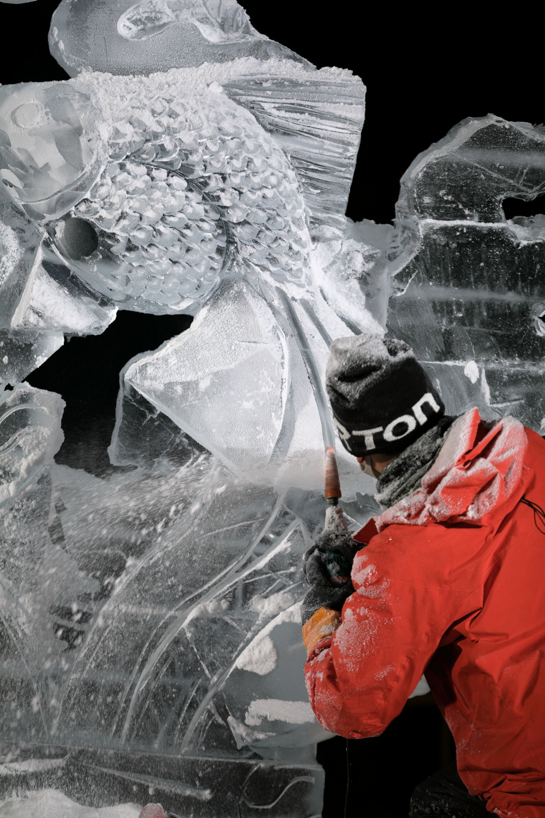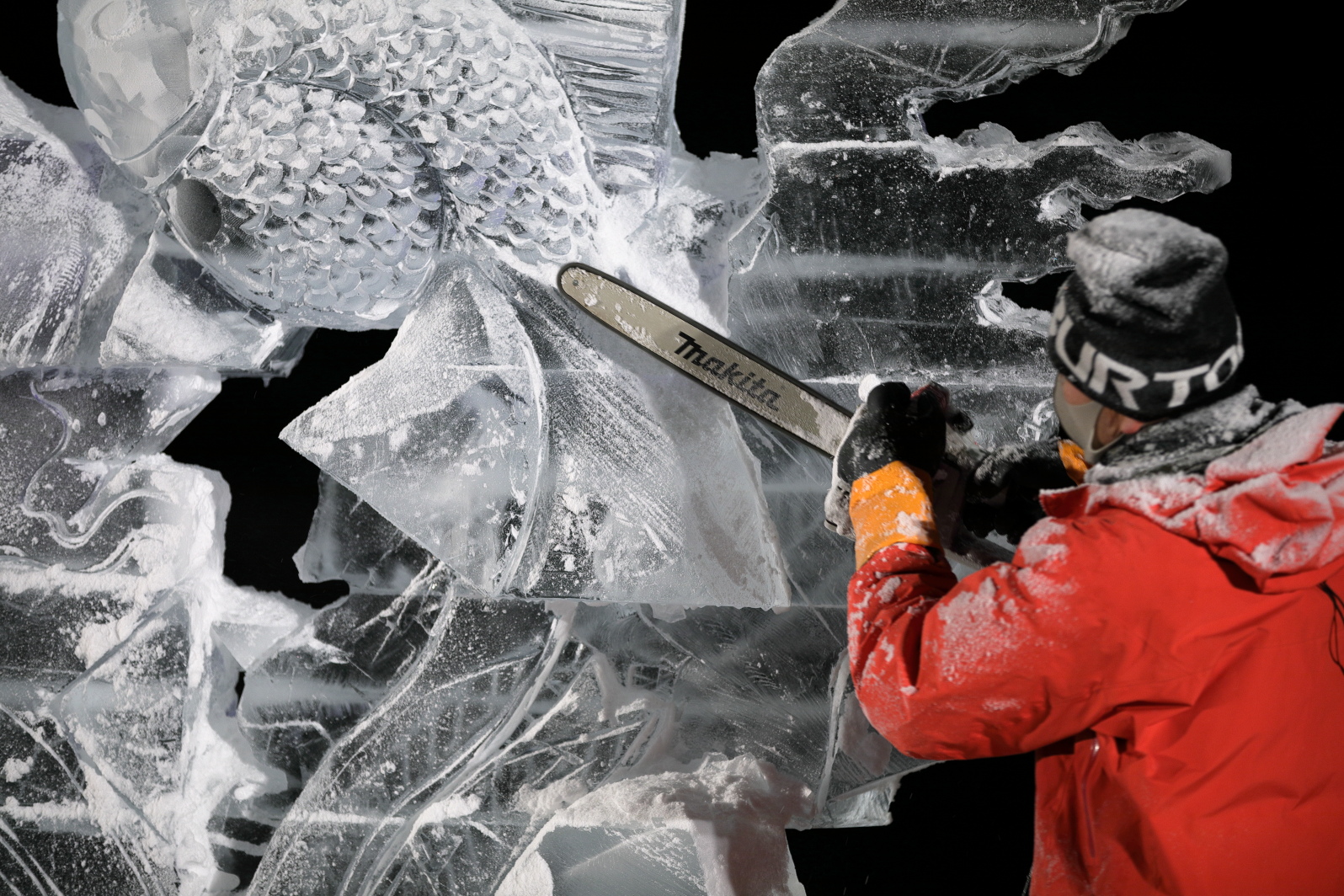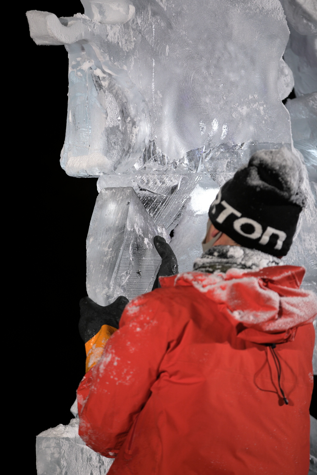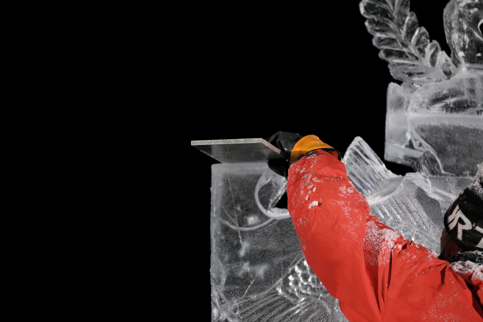 作業で出た氷屑「残氷(ざんぴょう)」の回収が入る。