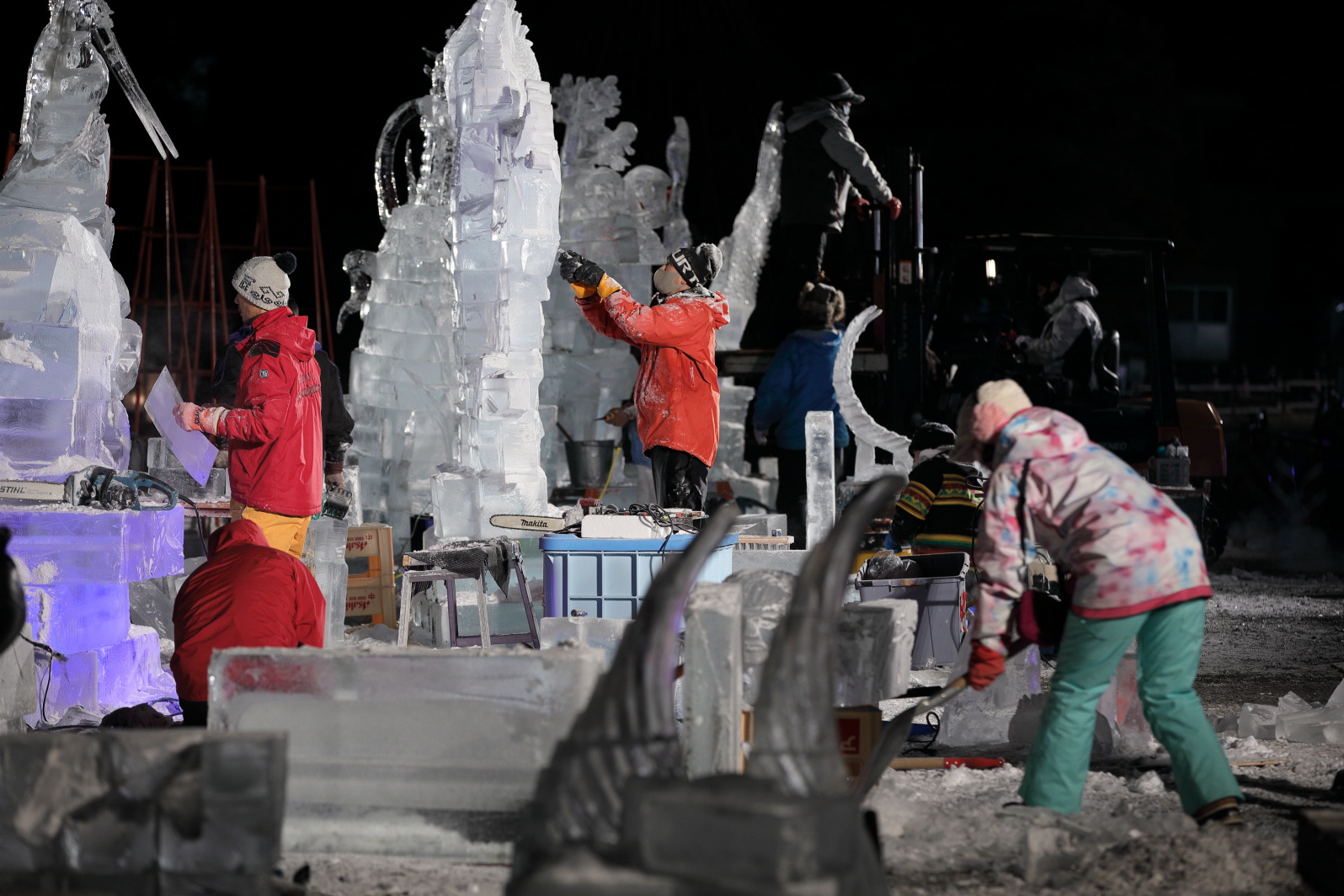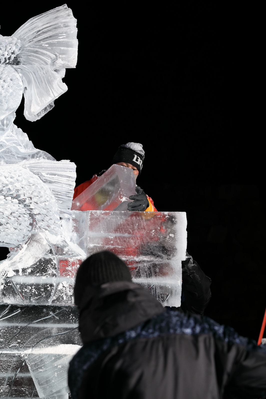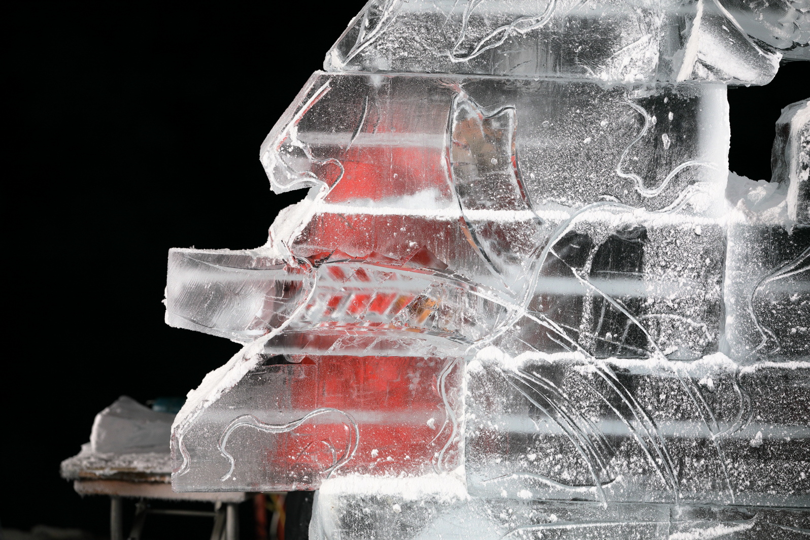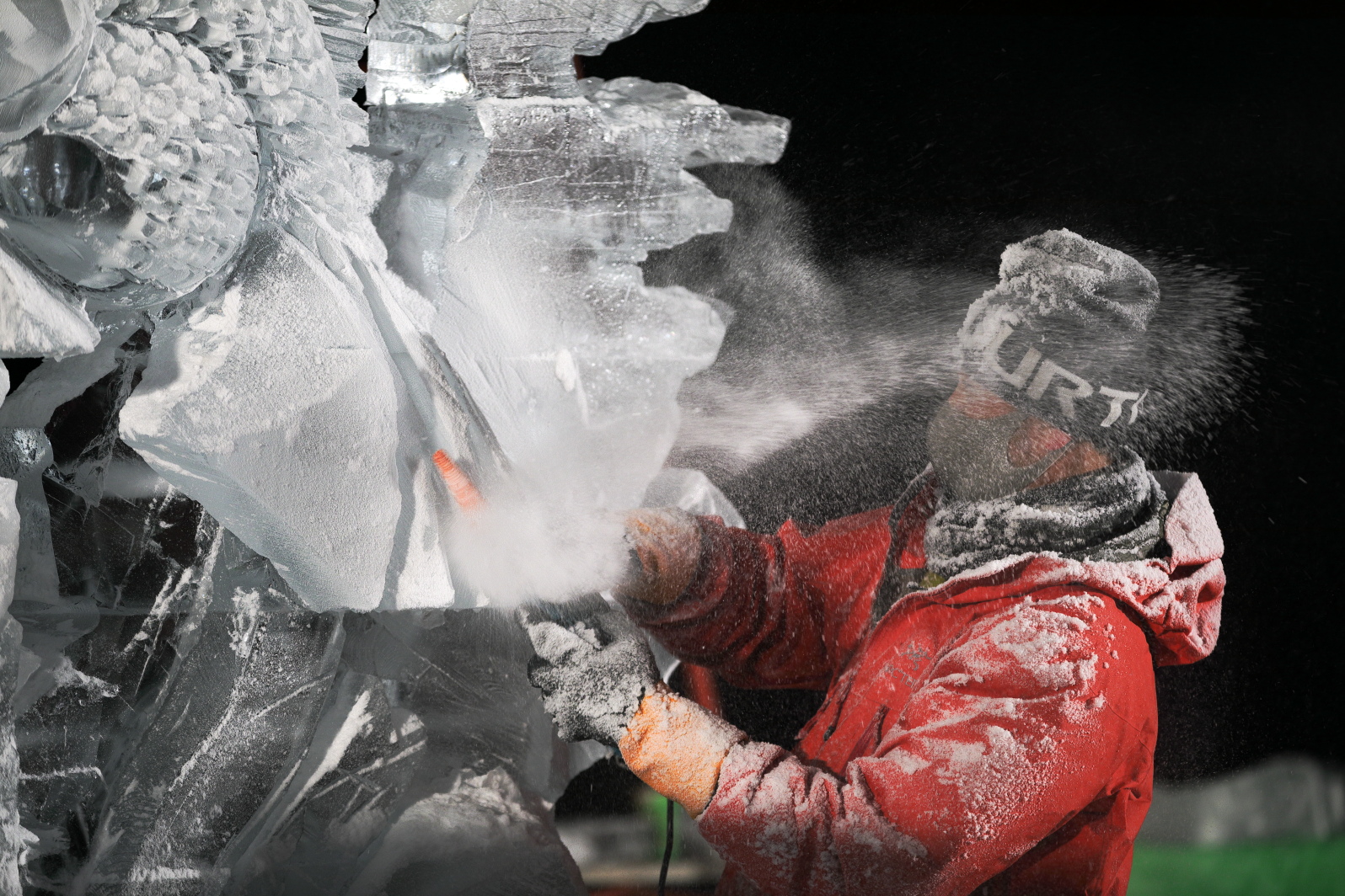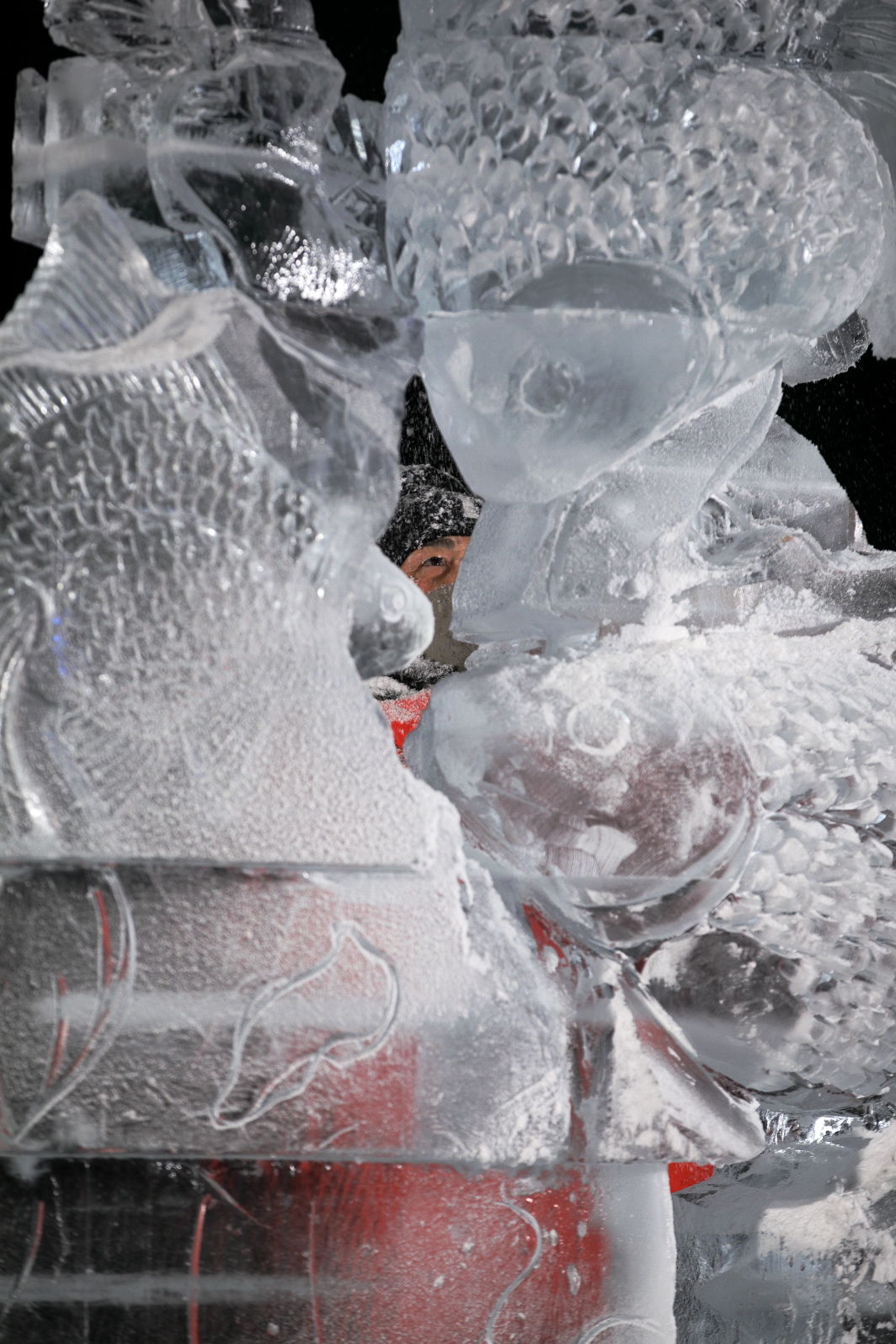 作業で出た氷屑「残氷(ざんぴょう)」の回収が入る。