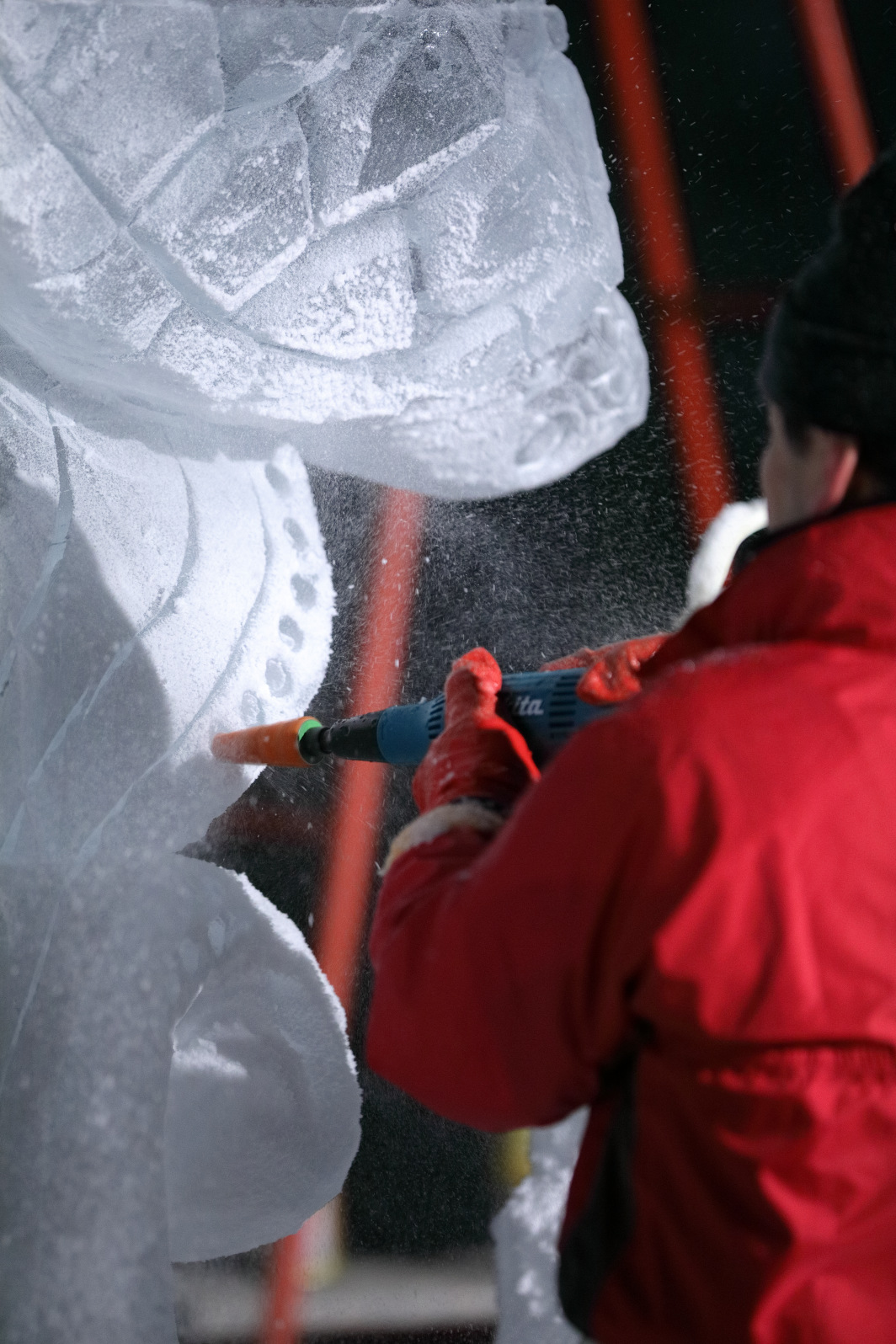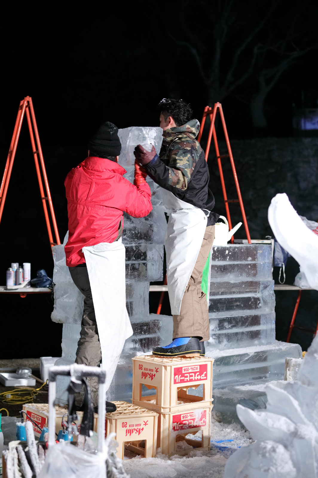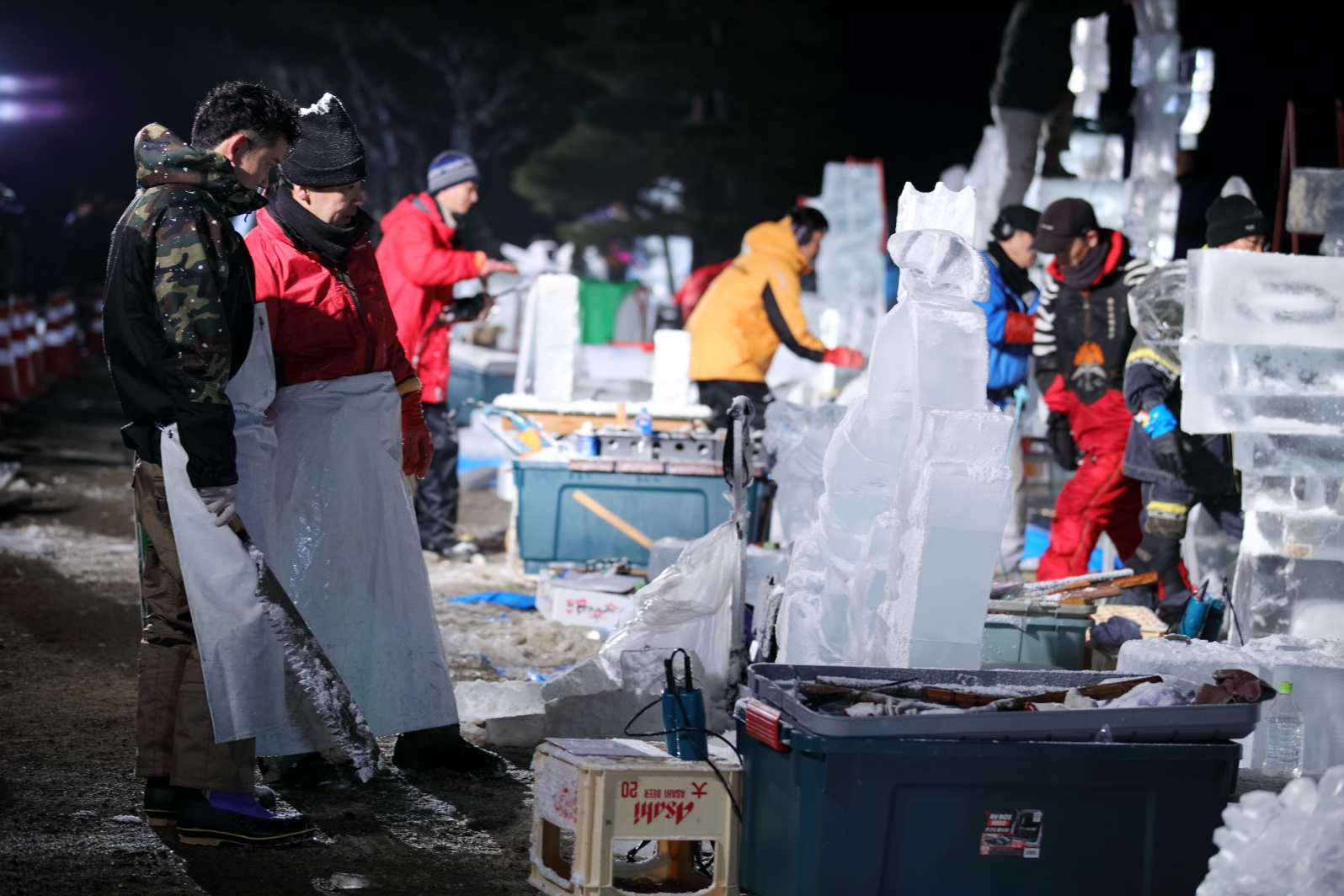 製作陣が徹夜で氷彫刻を彫り上げられるよう、