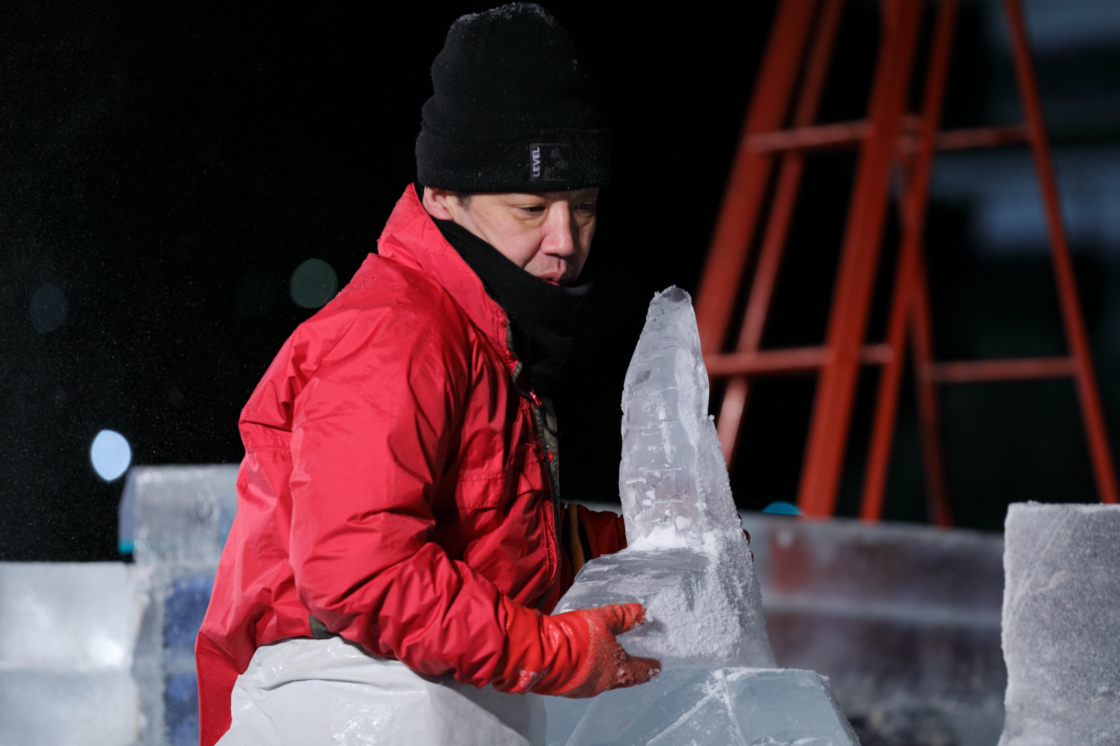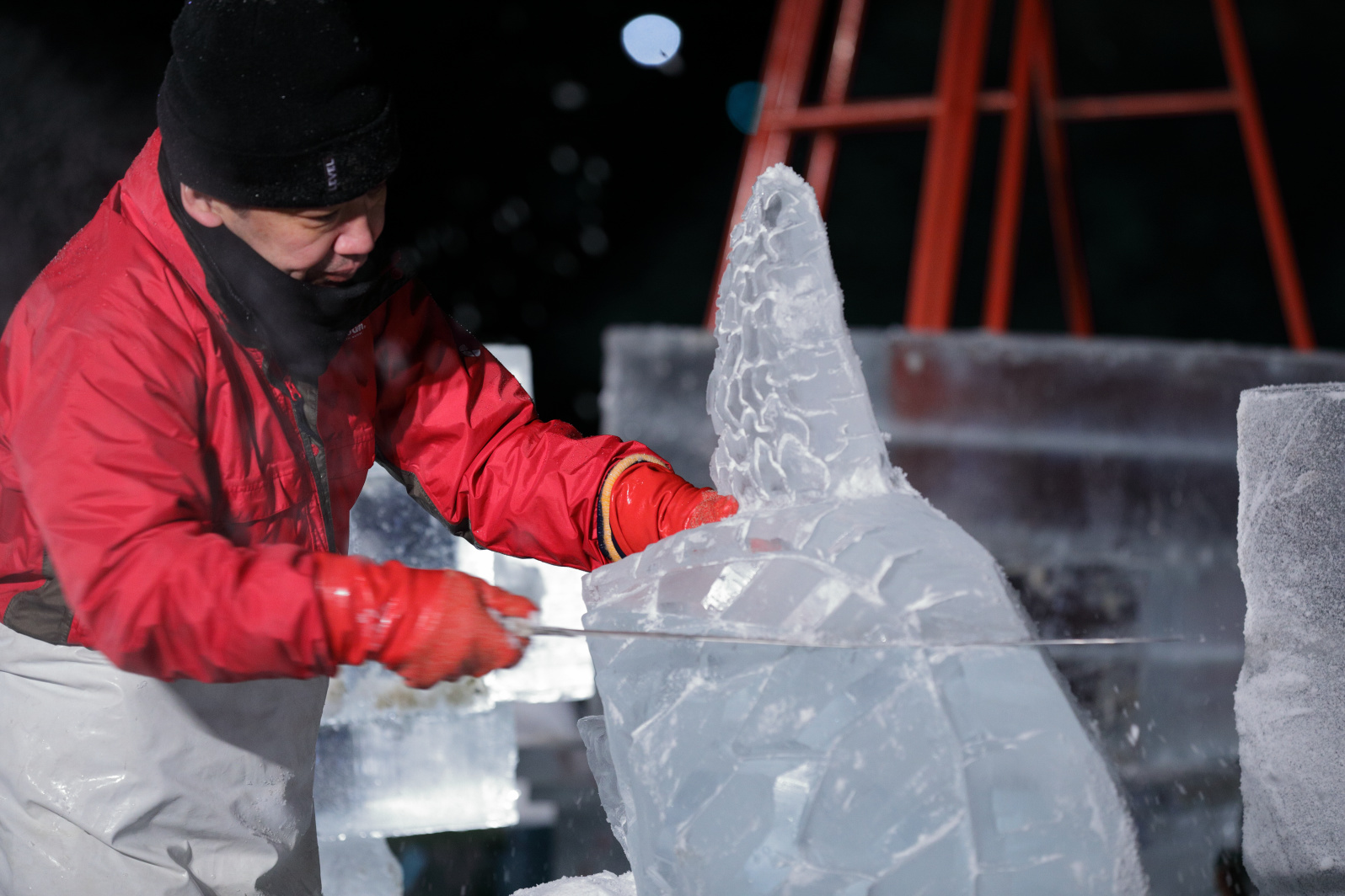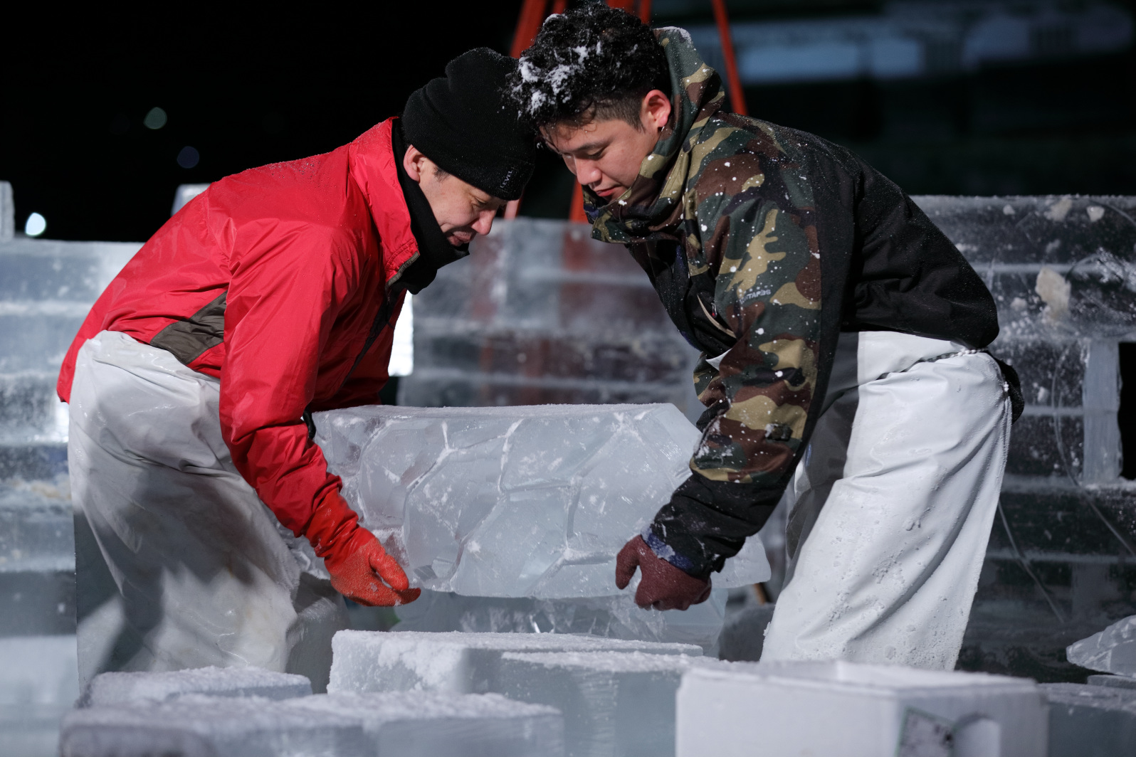 製作陣が徹夜で氷彫刻を彫り上げられるよう、