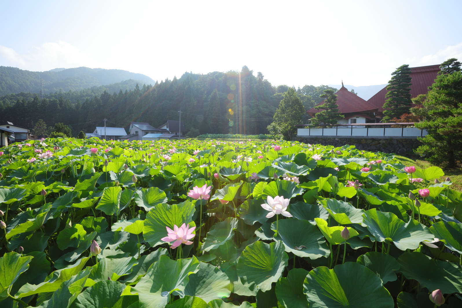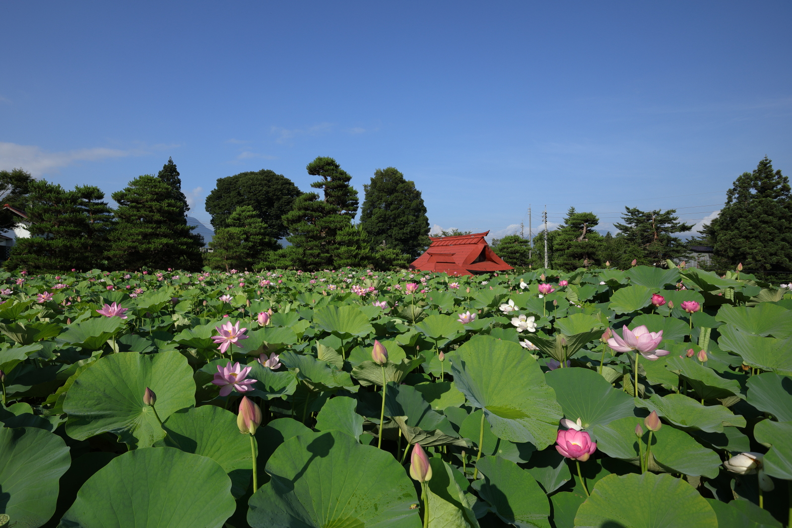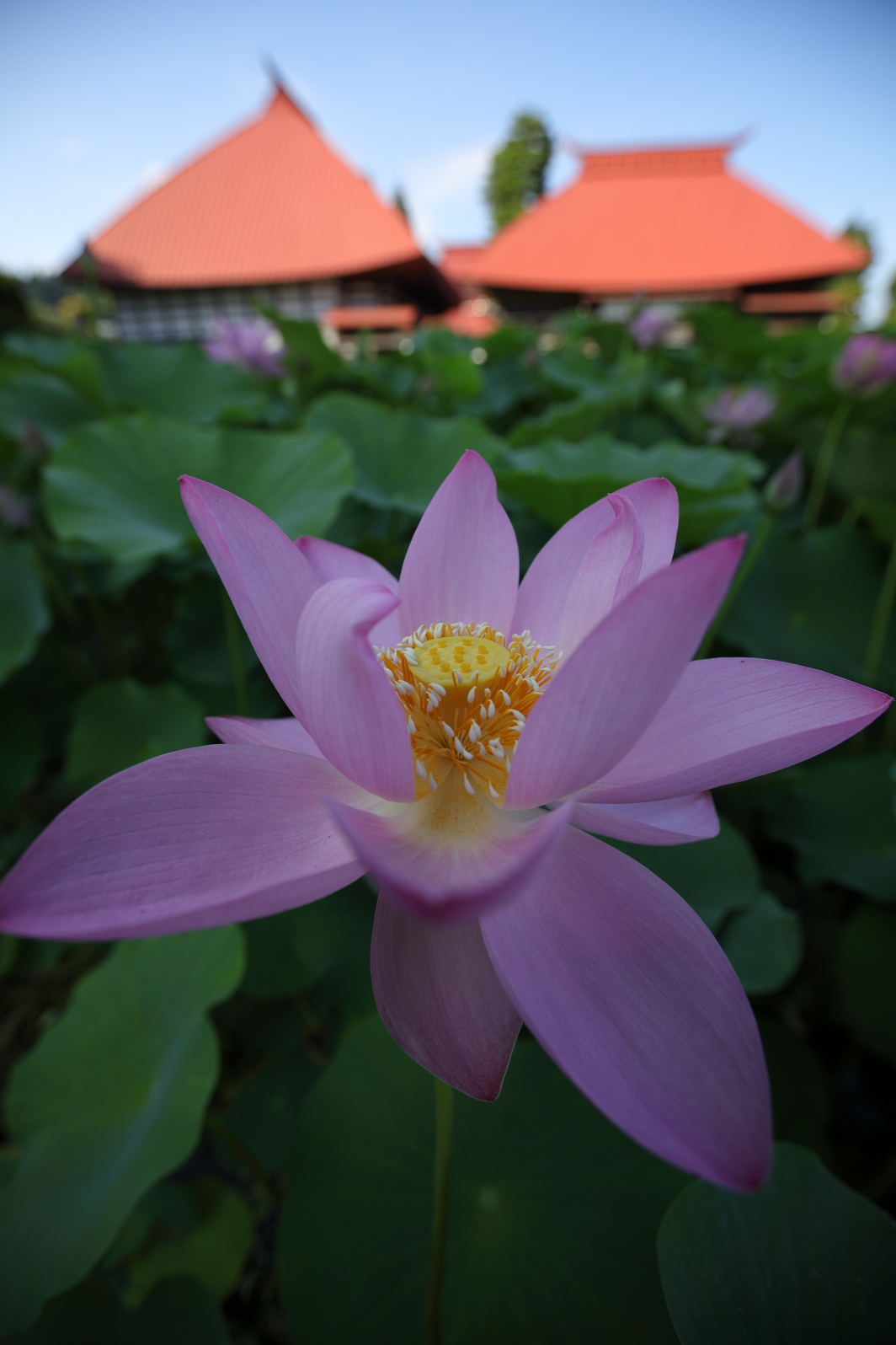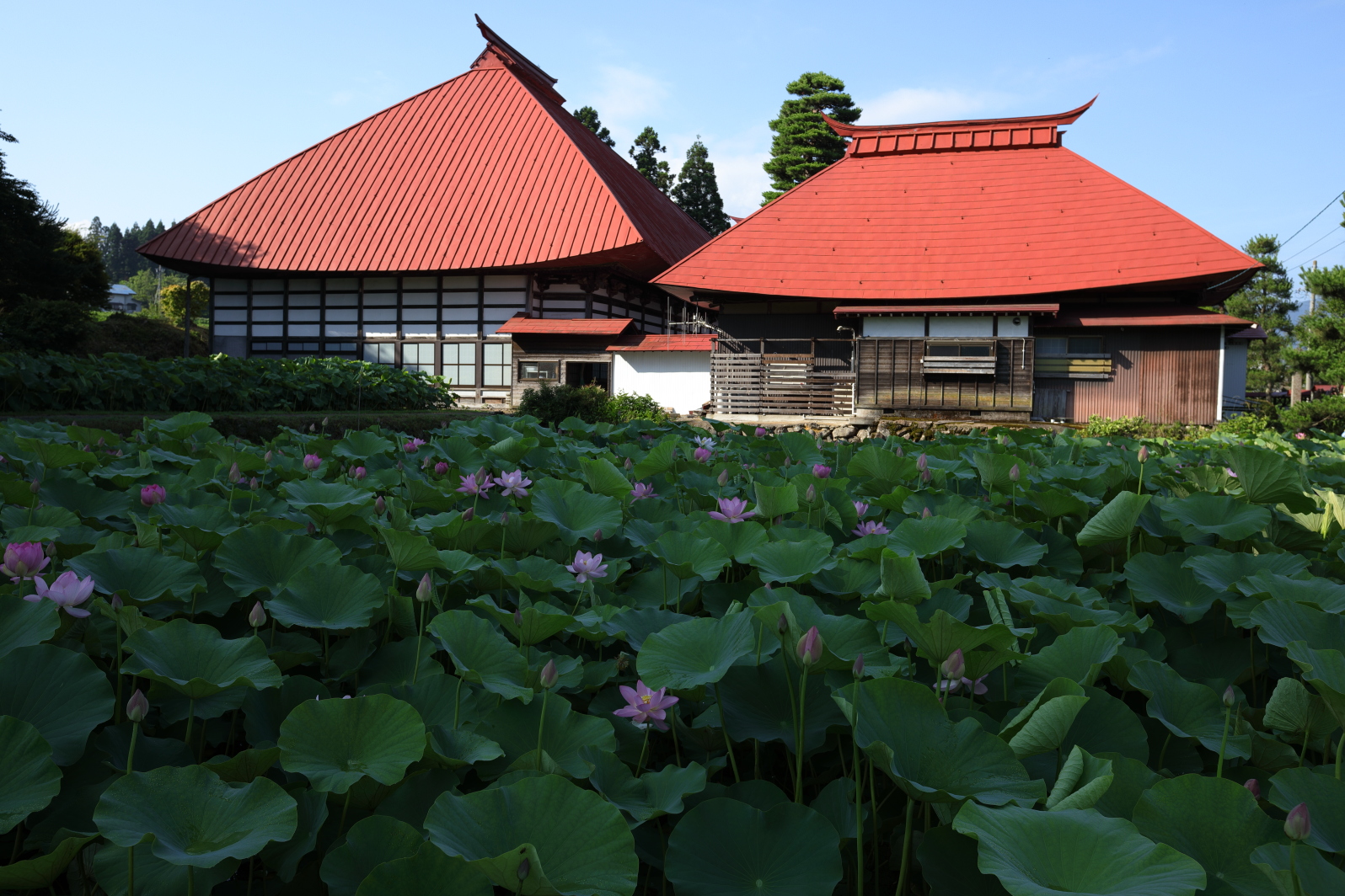 お寺の赤屋根と蓮田。