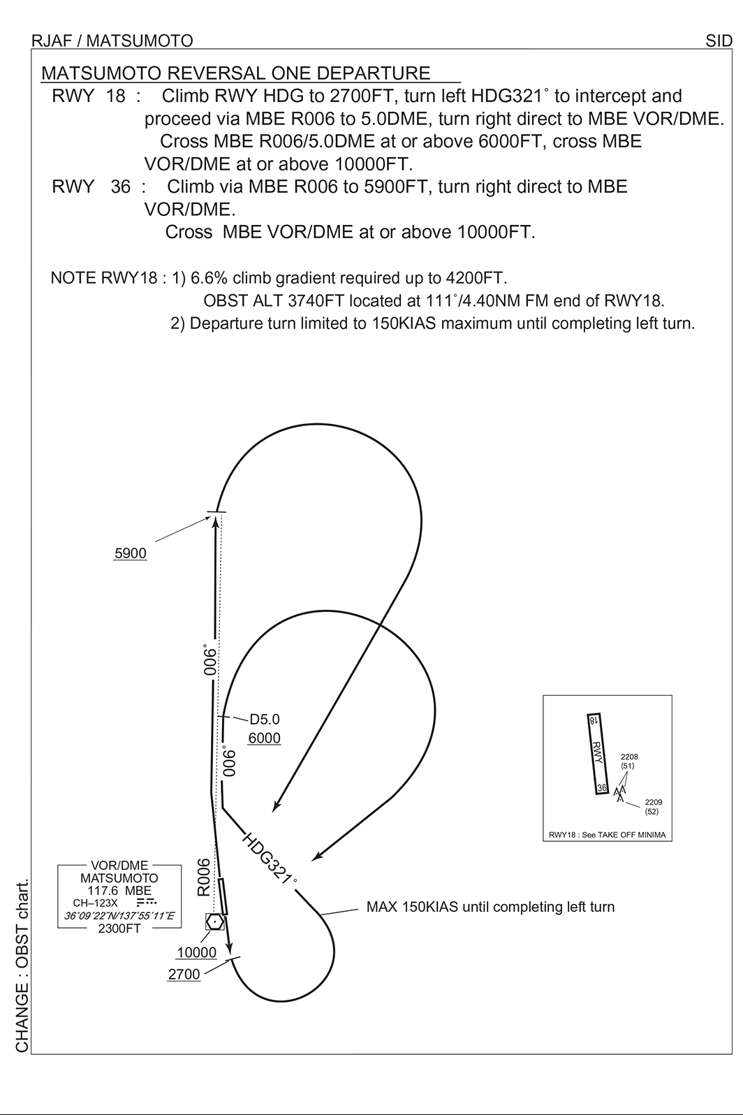 1 航空無線標識(VOR/DME松本)から方位006で5900フィート(1798m)まで上昇。 2 右旋回して航空無線標識の直上へ向かう。 3 航空無線標識上空を10000フィート(3048m)以上で通過。