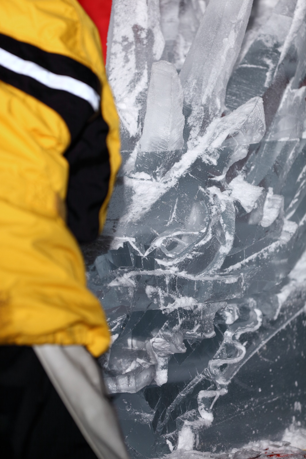 氷柱の表面ハツリ工程(平田謙三・平田浩一・氷彫刻『龍』)