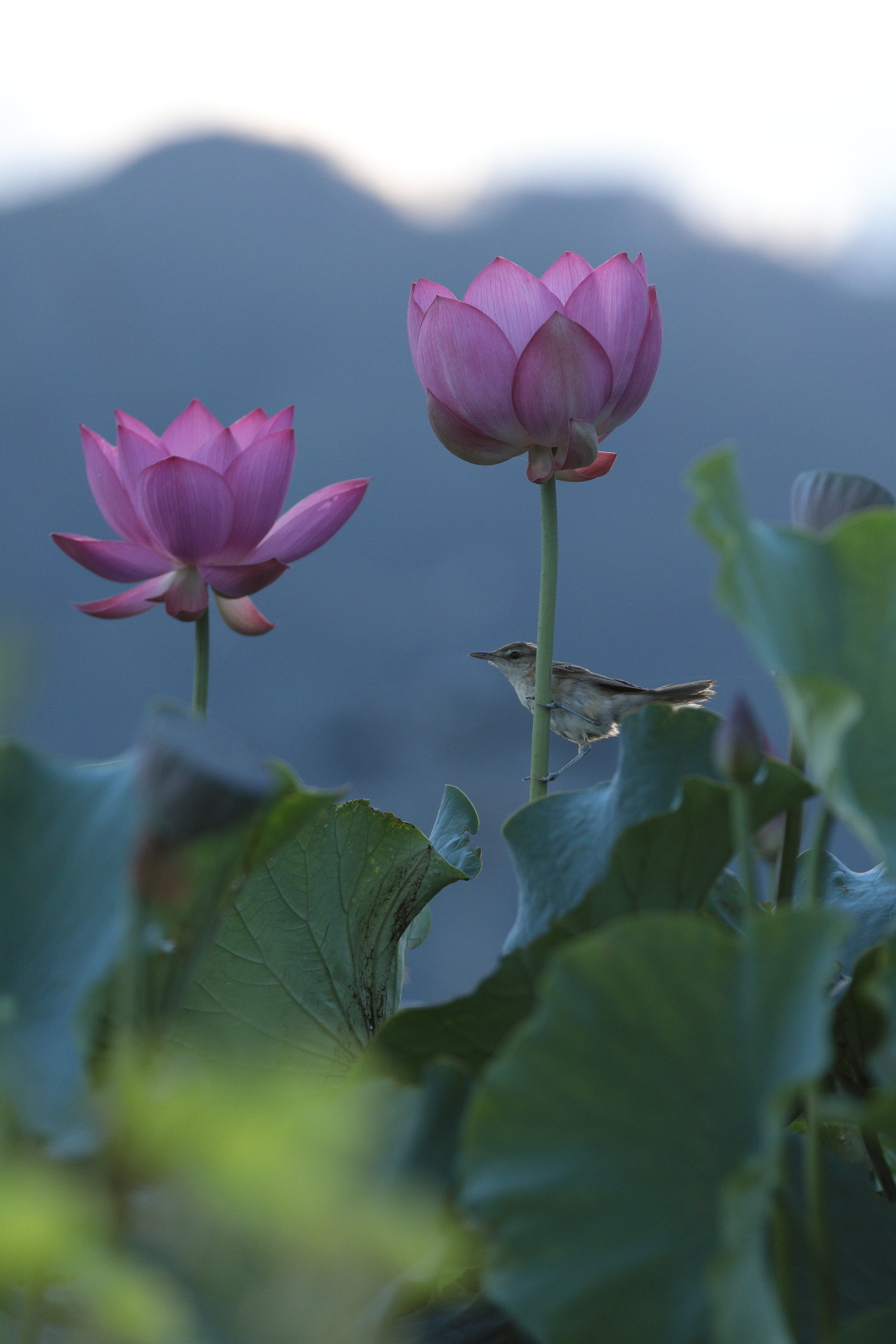 ハスの茎に小鳥が止まって
