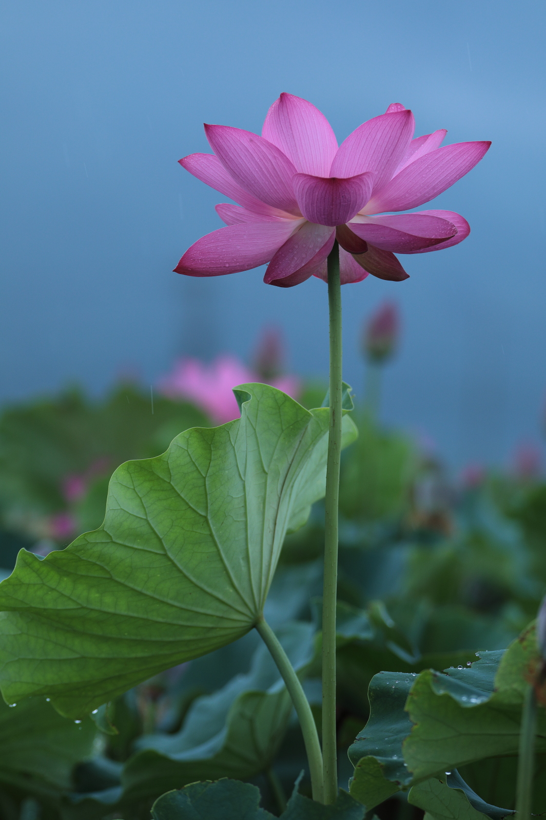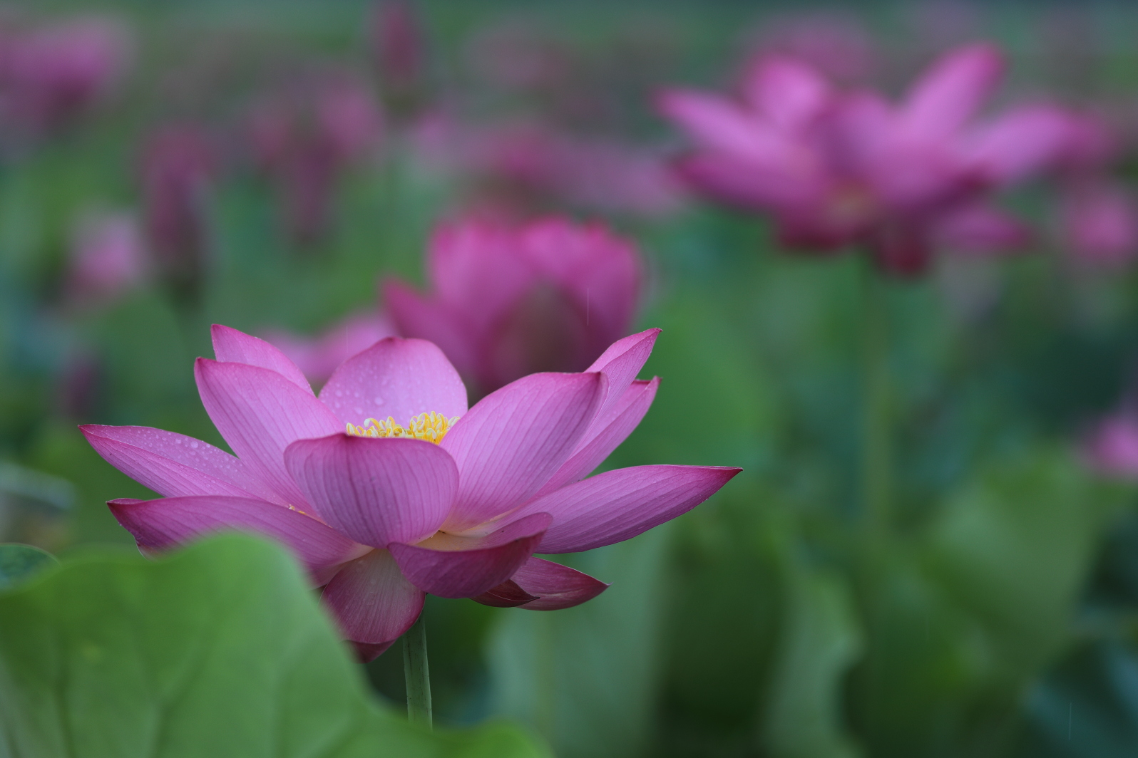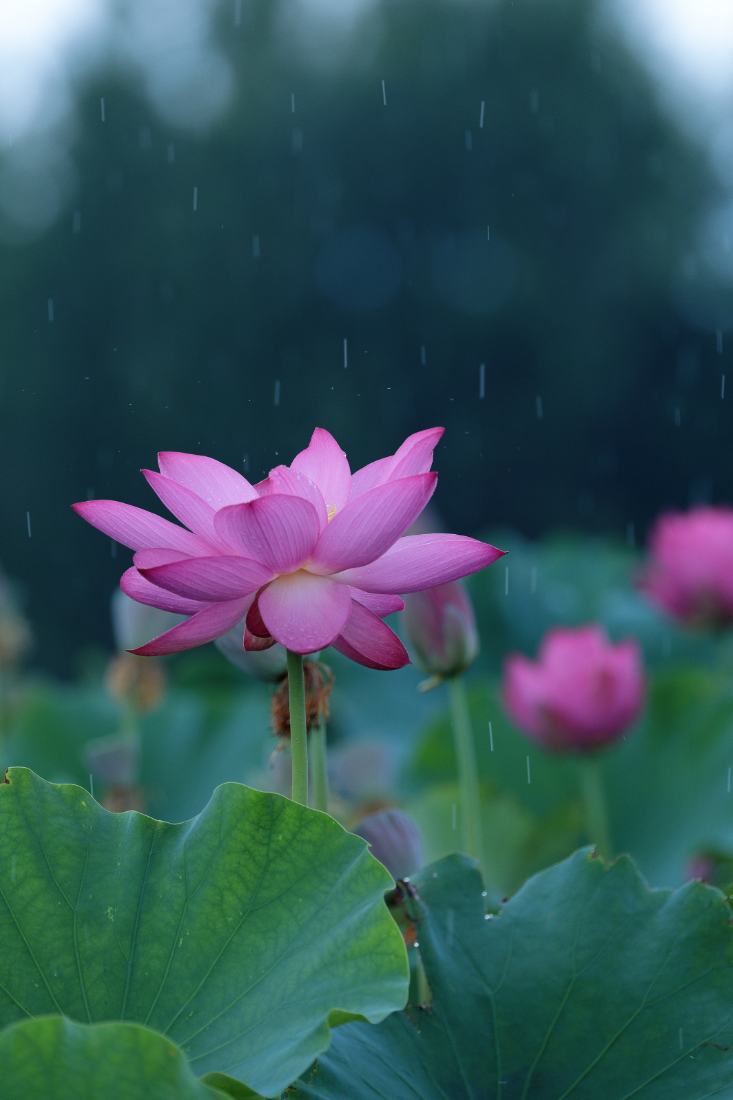 雨粒が蓮の葉を一斉に叩き、